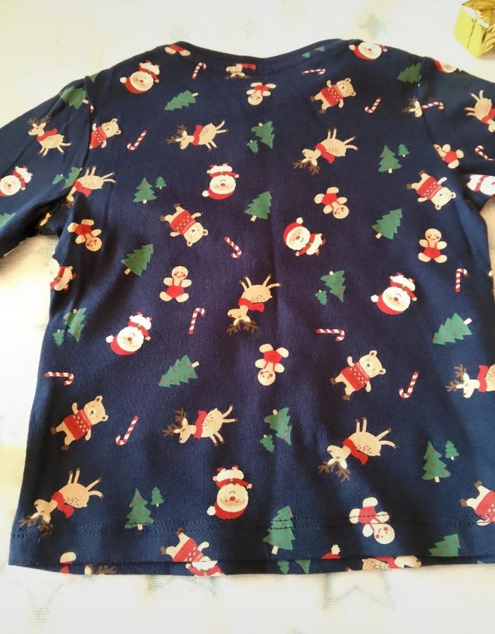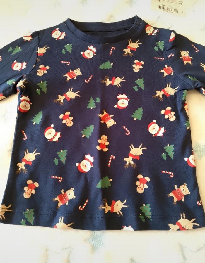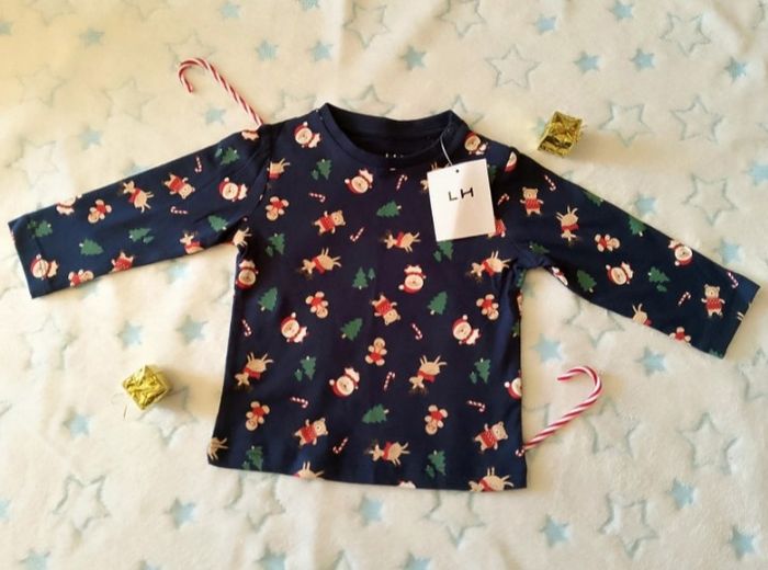 Tee-shirt LH 12 mois – Neuf avec étiquette 🎄✨ Joli tee-shirt manches longues pour bébé, thème Noël 🎅🦌🎁 Motifs festifs : Père Noël, rennes, sapins et petits oursons. ✅ 100% coton ✅ Taille : 12 mois/74cm ✅ Marque : LH ✅ État : Neuf avec étiquette Idéal pour les fêtes de fin d’année ou pour de jolies photos de Noël 📸 💰 Prix 4€
