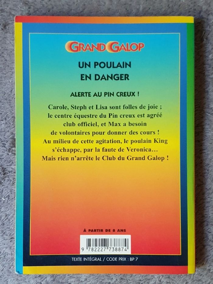 Résumé : Carole, Steph et Lisa sont folles de joie, le centre équestre du Pin Creux est agréé Club Officiel et Max a besoin de volontaires pour donner des cours. Au milieu de cette agitation, le poulain King s'échappe, par la faute de Veronica... Mais rien n'arrête le Club du Grand Galop!.. Année de parution : 1999. Auteur : Bonnie Bryant. Illustrateur : Paul Casale. Série : Grand Galop. Collection : Bayard Poche. Éditions : Bayard Jeunesse. =) 120 pages. Très bon état général! Juste de très légères traces d'usage sur couverture (à peine visibles). L'intérieur du livre est nickel!