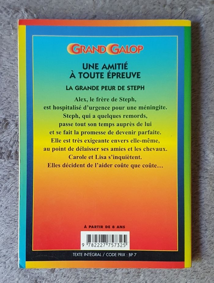 Résumé : Alex, le frère jumeau de Steph, est hospitalisé. Les médecins diagnostiquent une méningite. Dès lors, pour Steph, plus rien n'a d'importance, elle passe son temps auprès de son frère et se promet de devenir parfaite. Elle devient si exigeante envers elle-même que ses amies s'inquiètent et décident de lui venir en aide.. Année de parution : Mai 2001. Auteur : Bonnie Bryant. Illustrateur : Michael Welpy. Série : Grand Galop. Collection : Bayard Poche. Éditions : Bayard Jeunesse. =) 140 pages. Très bon état général! Juste de très légères traces d'usage sur couverture (à peine visibles). L'intérieur du livre est nickel!