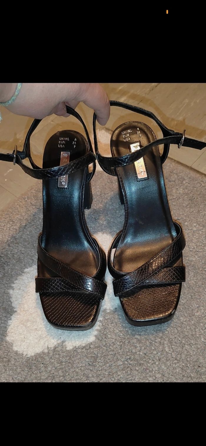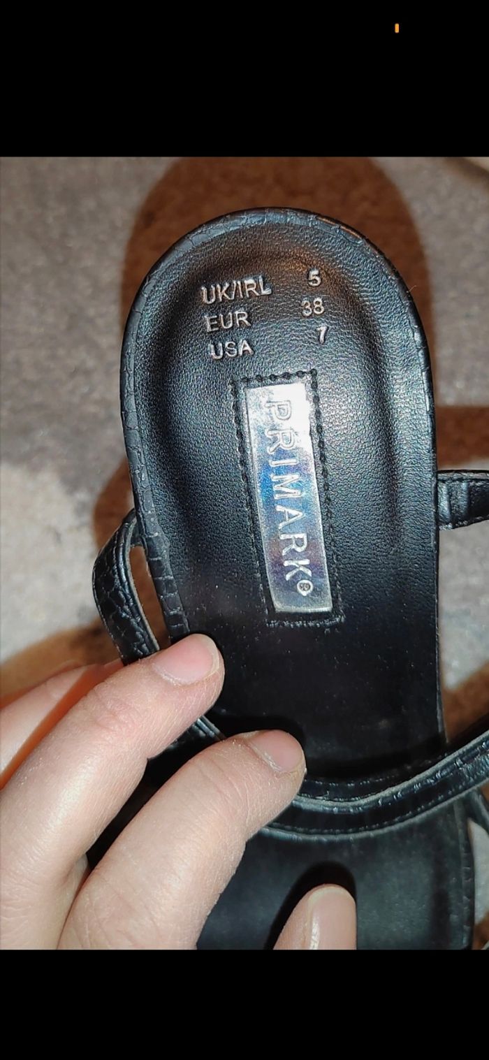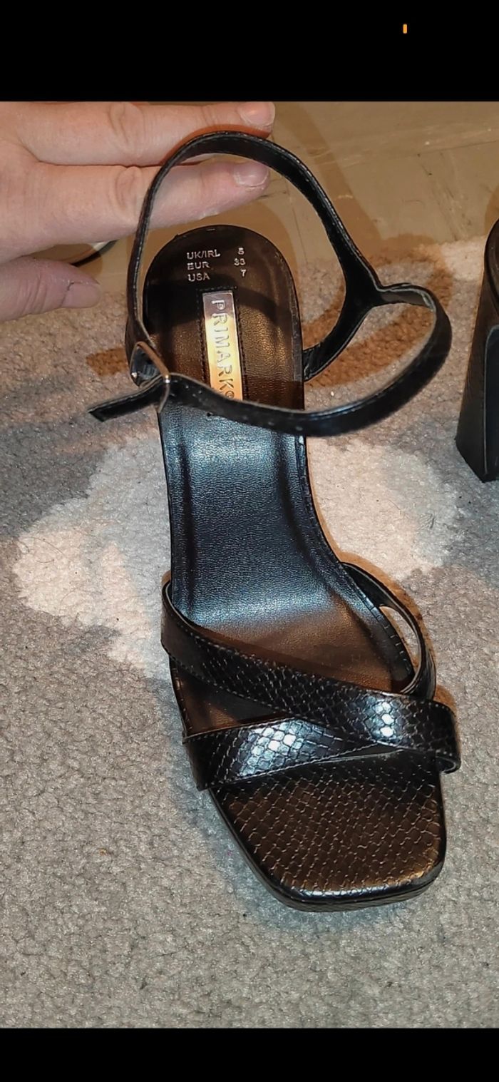Couleur noir taille 38 porté 1 fois pour une mariage taille talon il me semble que ces du 8 cm. Matière faut cuire.