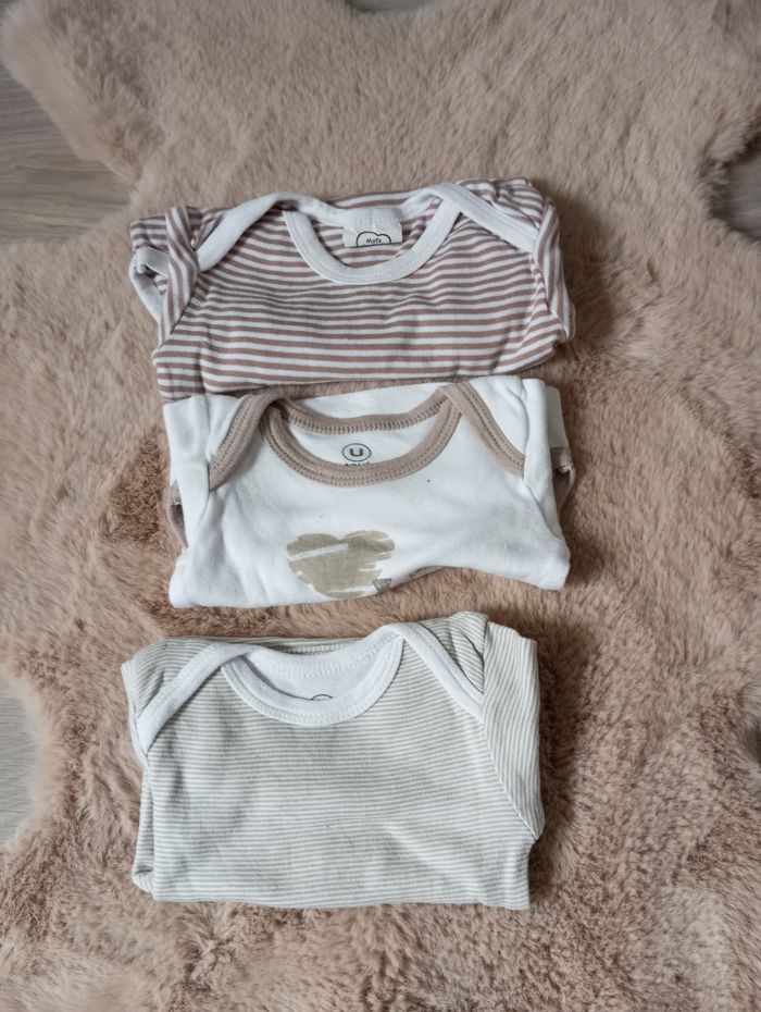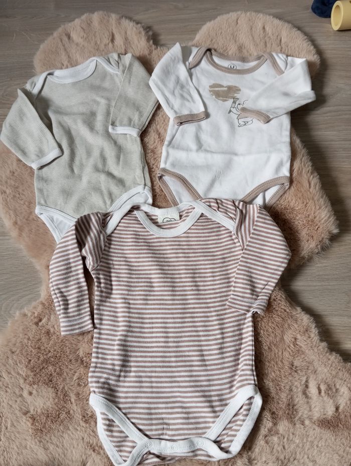 Lot de 3 bodies manches longues ton marron beige, taille 6 mois.
