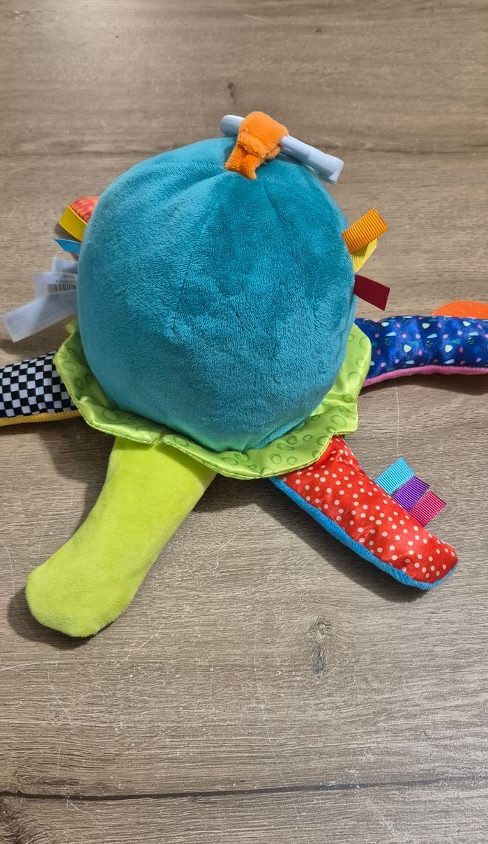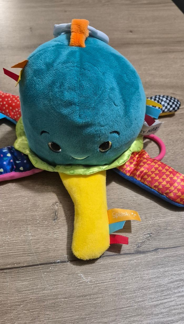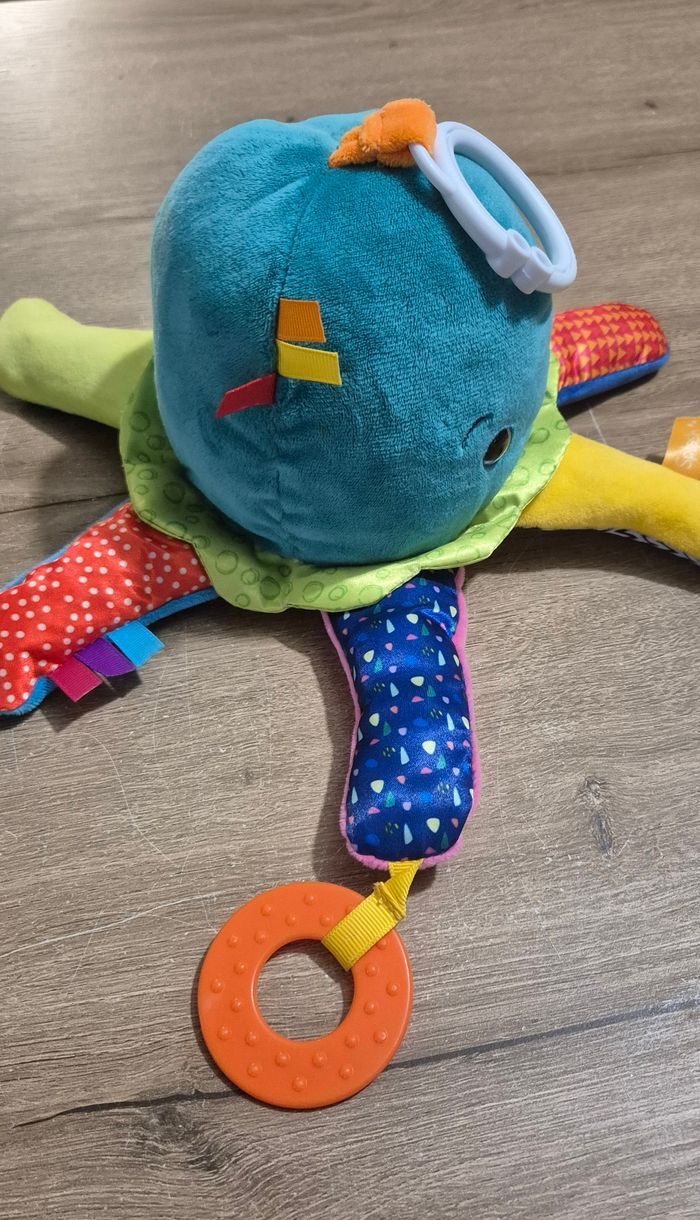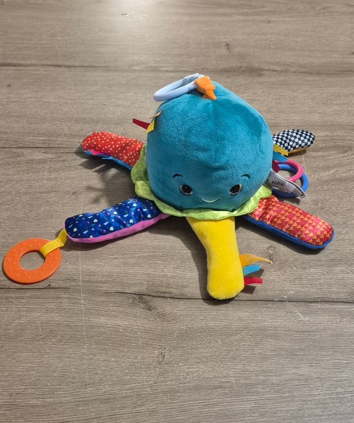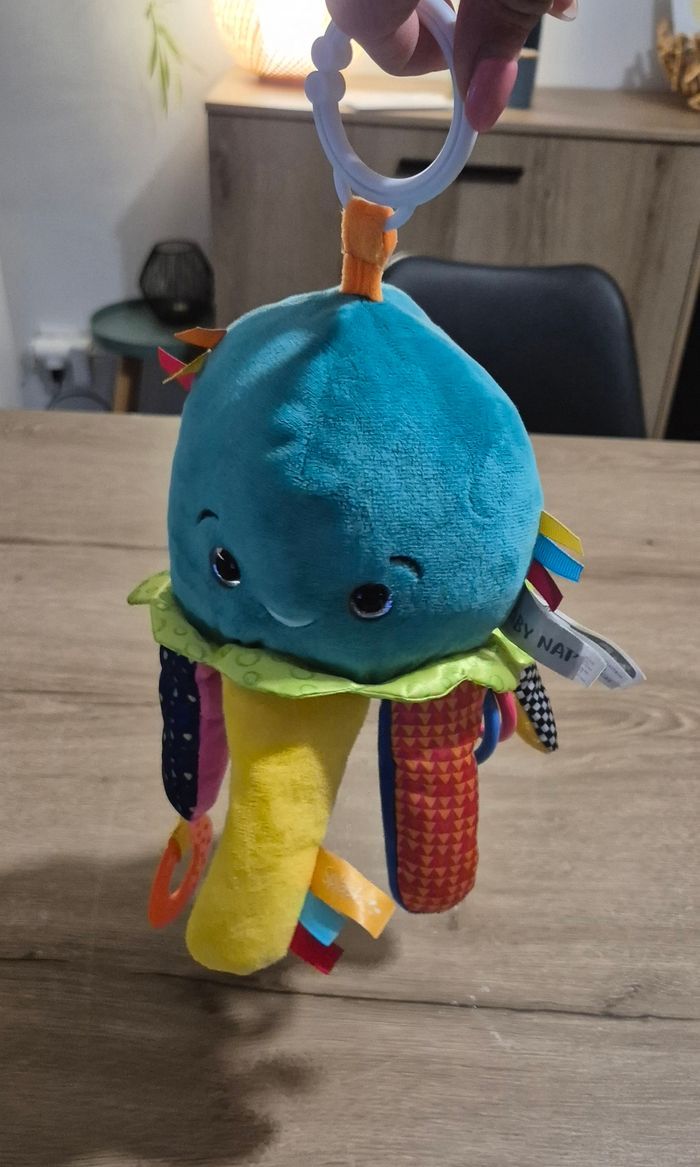 Peluche d'activités toute douce Bubulle la pieuvre qui peut se suspendre par l'anneau Miroir, bruit de papier froissé, anneau de dentition, pouet, anneaux colorés, étiquettes et plusieurs matières Baby Nat' Parfait état