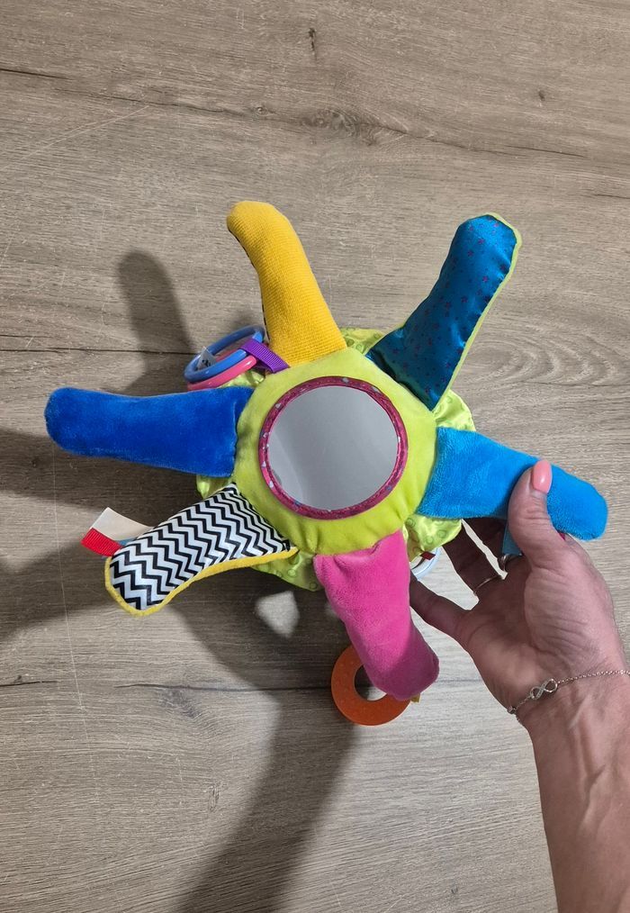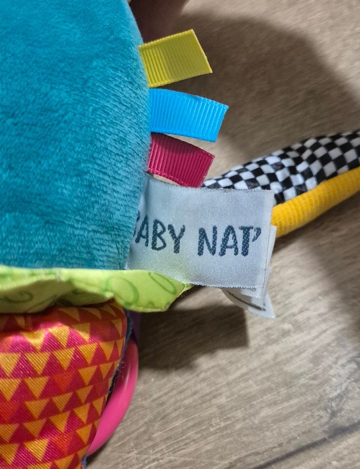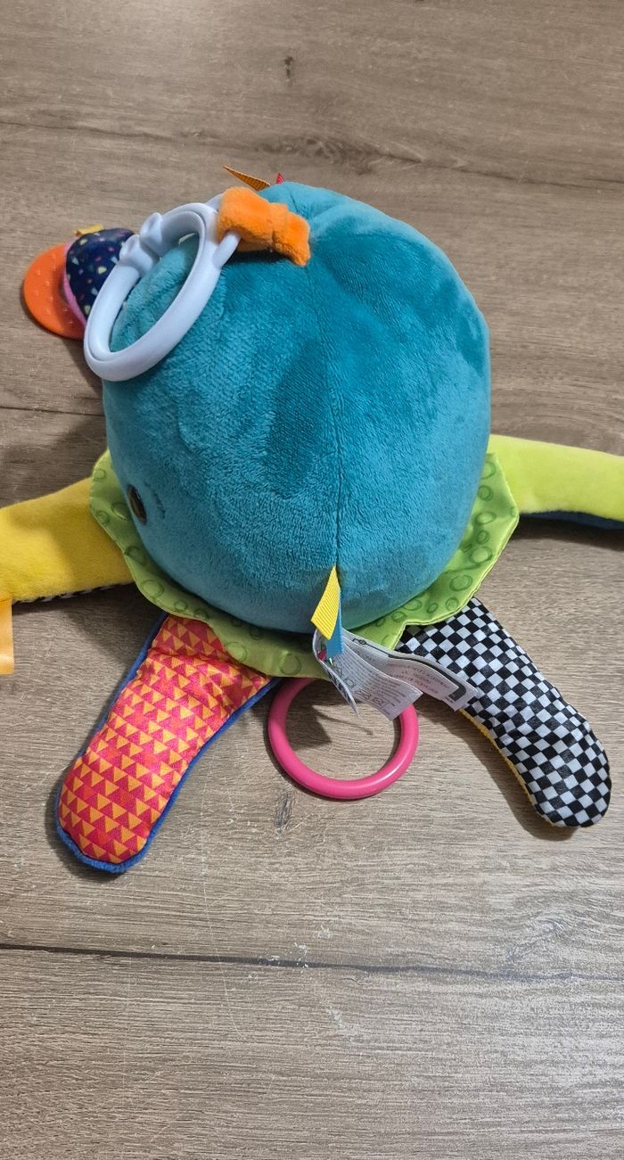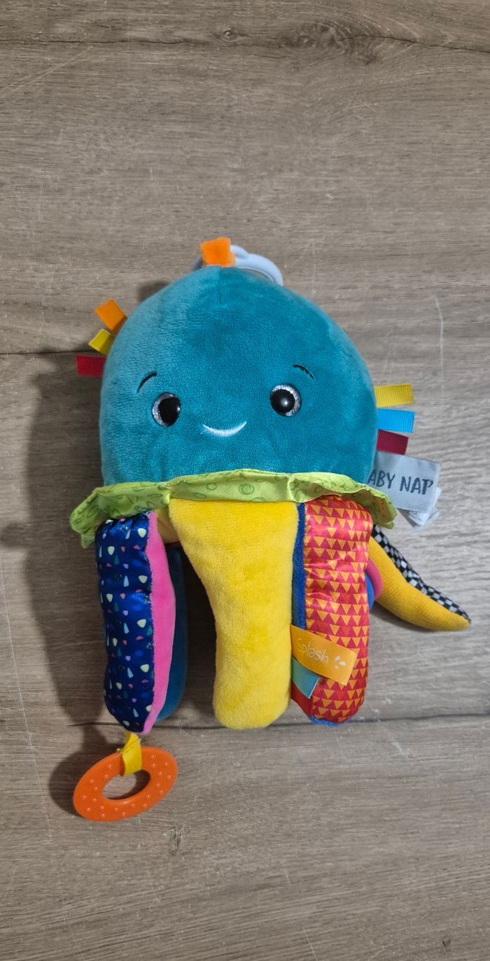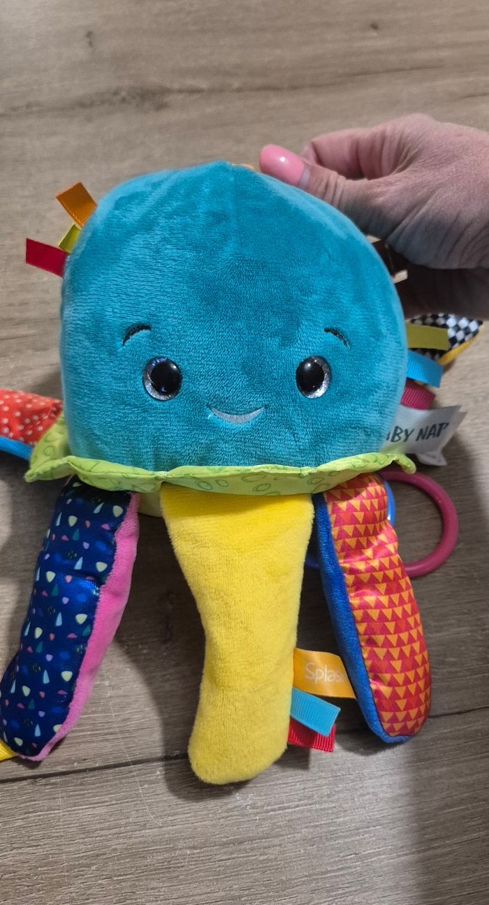Peluche d'activités toute douce Bubulle la pieuvre qui peut se suspendre par l'anneau Miroir, bruit de papier froissé, anneau de dentition, pouet, anneaux colorés, étiquettes et plusieurs matières Baby Nat' Parfait état