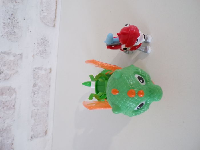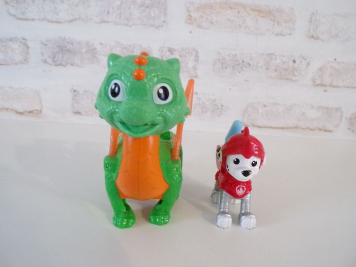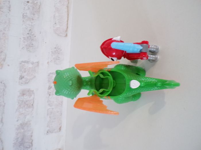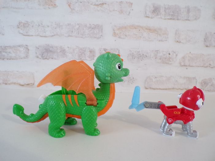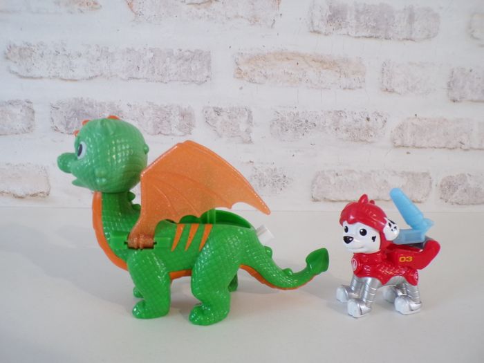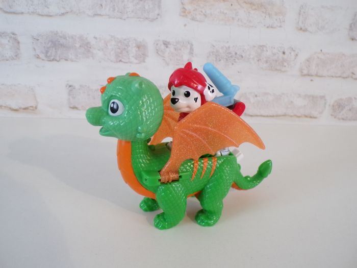 Dragon Jade - Chevalier Marcus - Paw Patrol - Pat Patrouille, comme neuf. Les ailes se déploient dès que l'on appuie sur le bouton. La tête du dragon n'est pas tout à fait de la même couleur que le corps, plus clair, nous l'avons acheté neuf comme ceci...