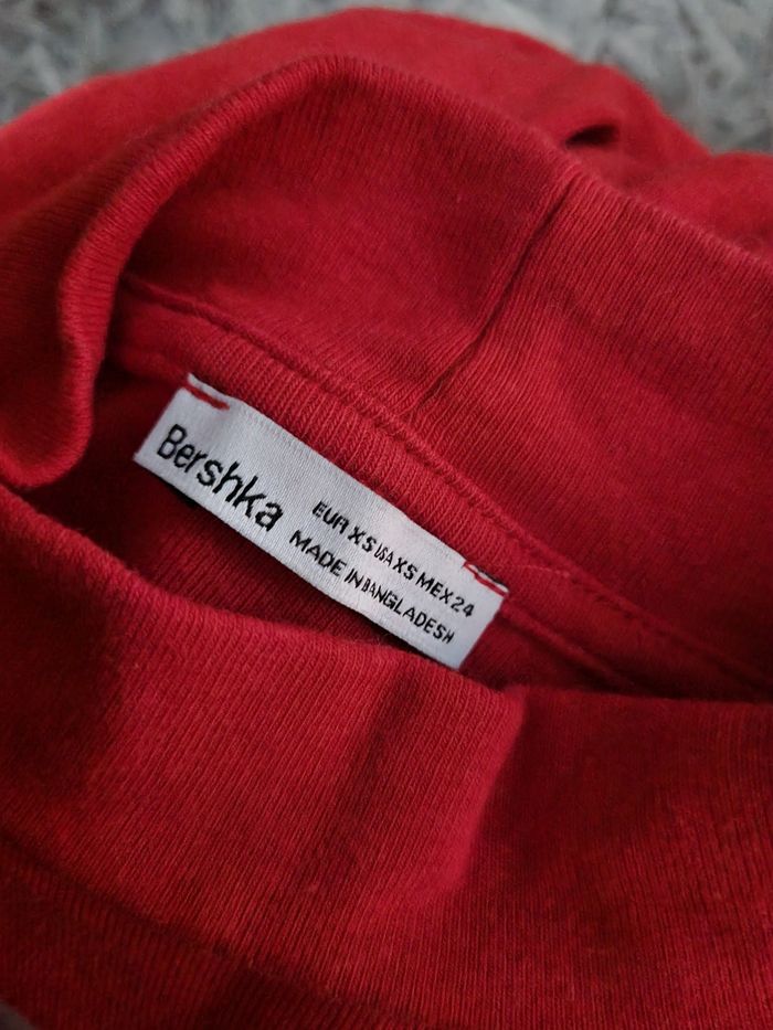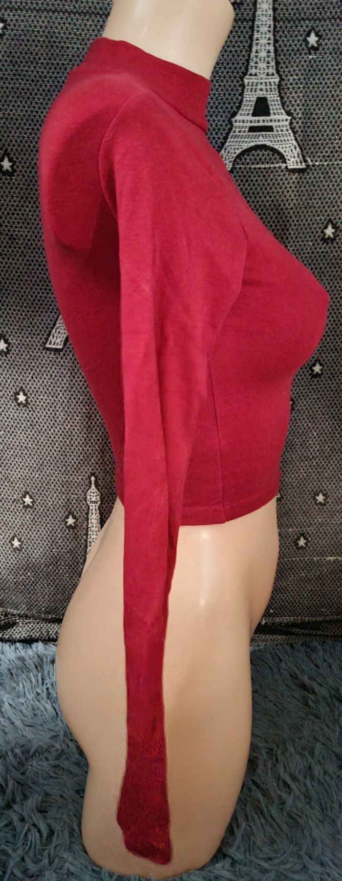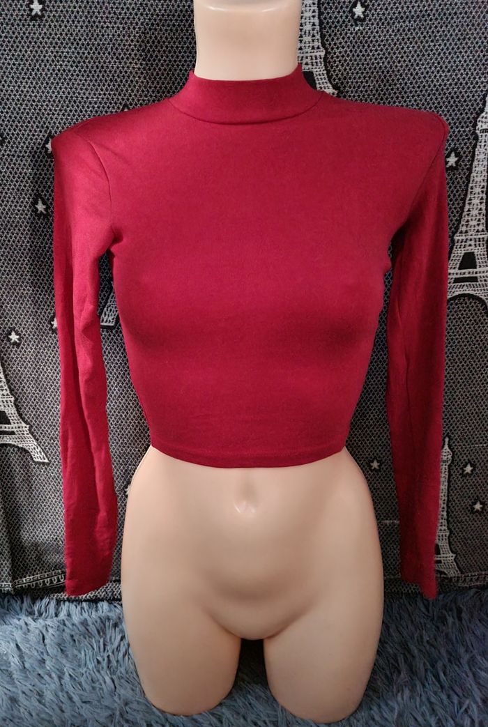 T-shirt court à manches longues, taille XS marque Bershka, longueur 39cm, largeur 27cm, longueur épaule à aisselle 15cm, largeur aisselle à aisselle 33cm, longueur manche 50cm.