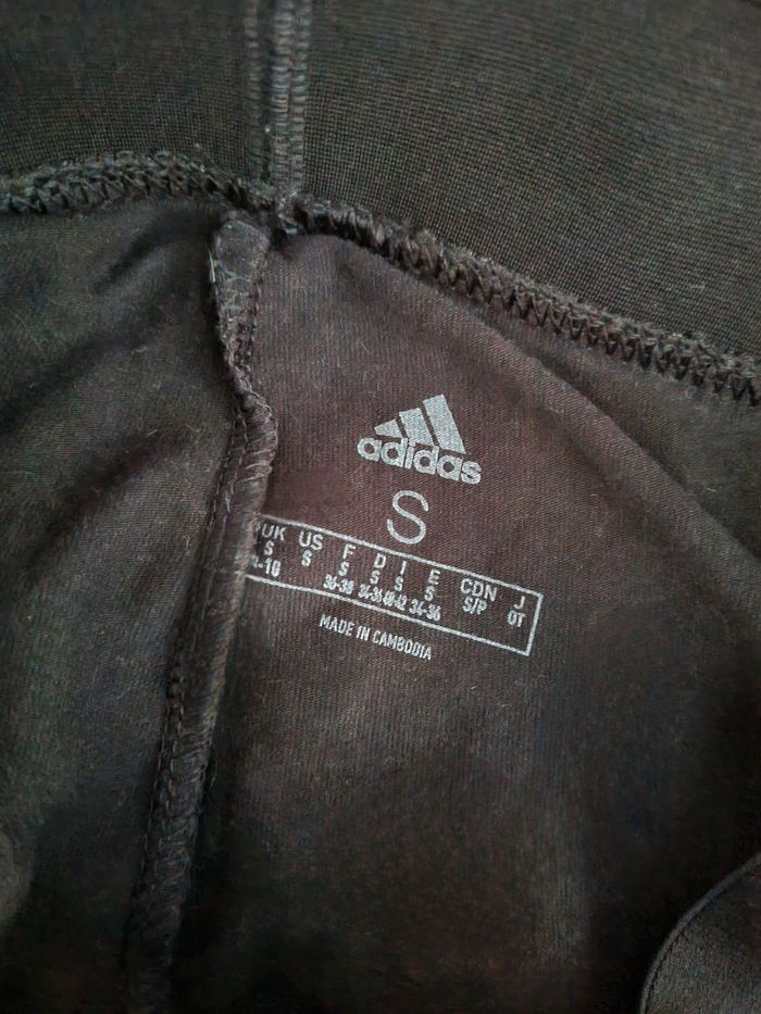 Legging de sport noir, marque Adidas taille S,élastique à la taille, longueur 90cm, largeur de la taille 32cm jusqu'à 36cm, largeur cuisse 24cm,largeur cheville 10cm.