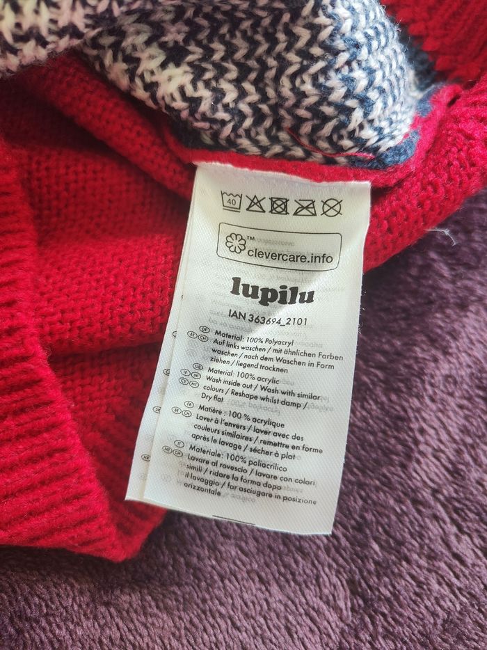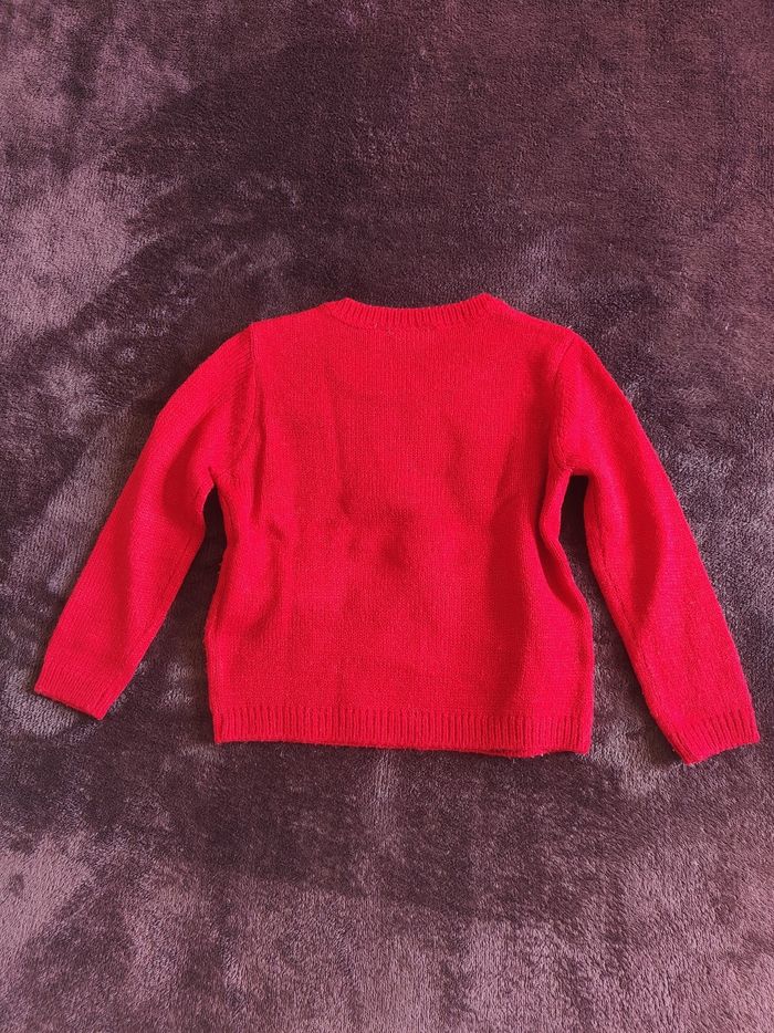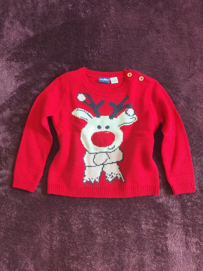 Pull de la marque Lupilu. Manches longues, col rond avec petits boutons. Couleur rouge avec dessin d'un mignon renne. Parfait pour célébrer les fêtes de fin d'année ! 🎄 Taille 12-24 mois. Très bon état à part que le nez rouge du renne pouvait s'allumer mais les piles ne doivent plus fonctionner. 100% Acrylique.