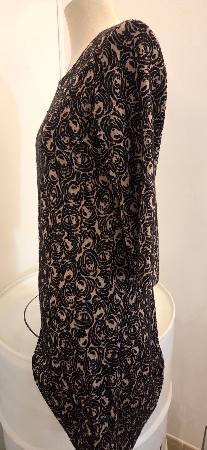 Magnifique robe La Fée Maraboutée, fabriquée en Italie 🇮🇹, au style chic et graphique. Son motif noir et beige à effet texturé et sa coupe droite légèrement ajustée en font une pièce à la fois élégante et facile à porter. Les manches 3/4, la maille douce et extensible, ainsi que la longueur genoux assurent un confort parfait, tout en gardant une allure féminine et moderne 🌸 Idéale pour le travail, une sortie ou un dîner, elle se porte aussi bien avec des bottines que des escarpins. 📏 Mesures à plat : Longueur totale : 91/92 cm Largeur sous bras : 41 à 51 cm (extensible) Longueur manches : 43 cm 👗 Taille : 1 (équivaut à un 38 FR) 🌿 Composition : 90 % acrylique, 8 % polyamide, 2 % élasthanne 💎 État : Excellent état, comme neuf 📦 Envoi rapide et soigné