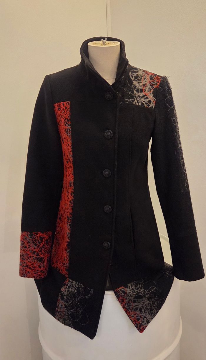 Manteau original Clara Vitti – coupe cintrée élégante – détails rouges artistiques – taille 38