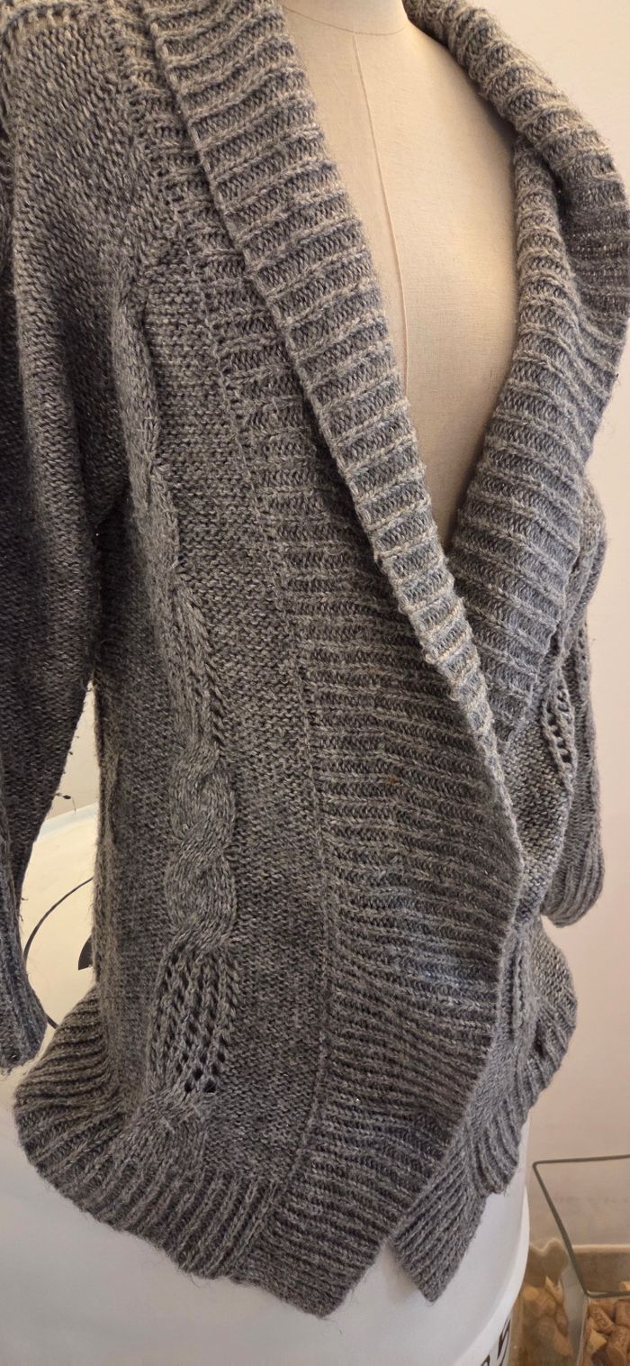 Magnifique gilet long Kaporal couleur gris chiné, au style à la fois chic et cocooning 🩶 Maille torsadée ajourée, grand col châle et coupe légèrement oversize pour un look décontracté mais toujours féminin. Idéal pour les journées fraîches d’automne/hiver – se porte aussi bien à la maison qu’en sortie casual avec un jean ou une robe ! 📏 Mesures : Longueur : 81 cm Largeur sous bras : 54 à 67 cm (maille extensible) Taille indiquée : S (convient du 36 au petit 40 selon le porté souhaité) 💎 État : Très bon état général — à noter : la petite plaque Kaporal est légèrement décousue d’un côté (voir photos), sans incidence sur le porté. 📦 Envoi rapide et soigné