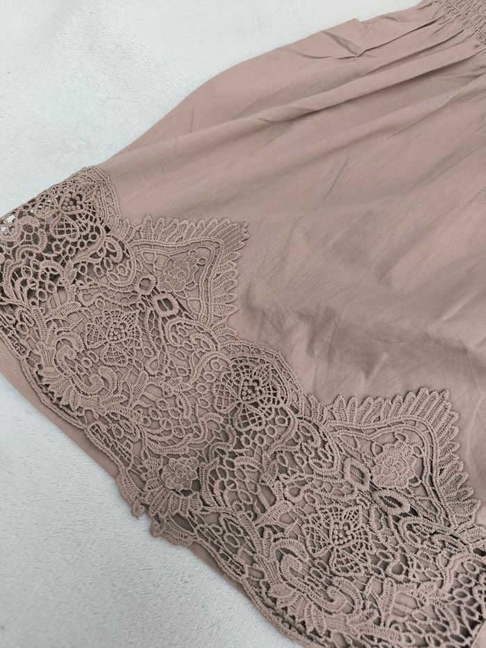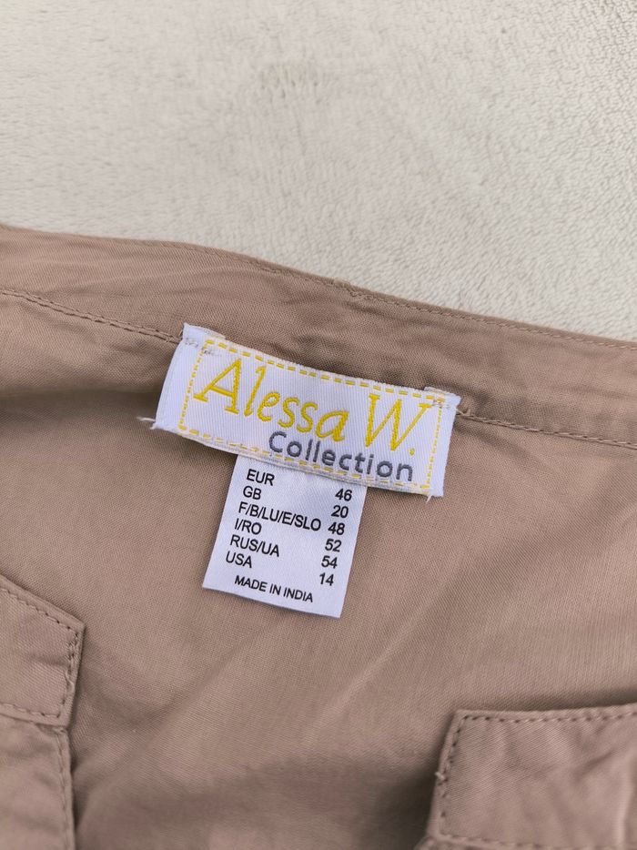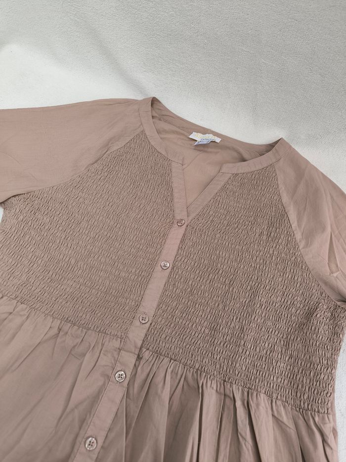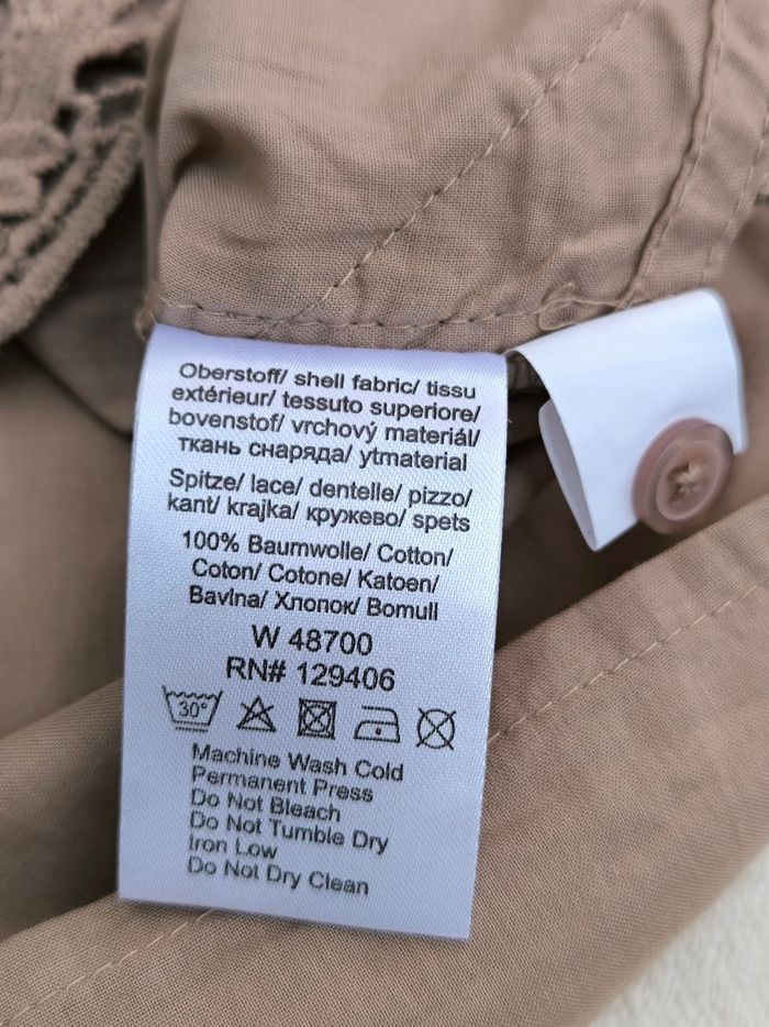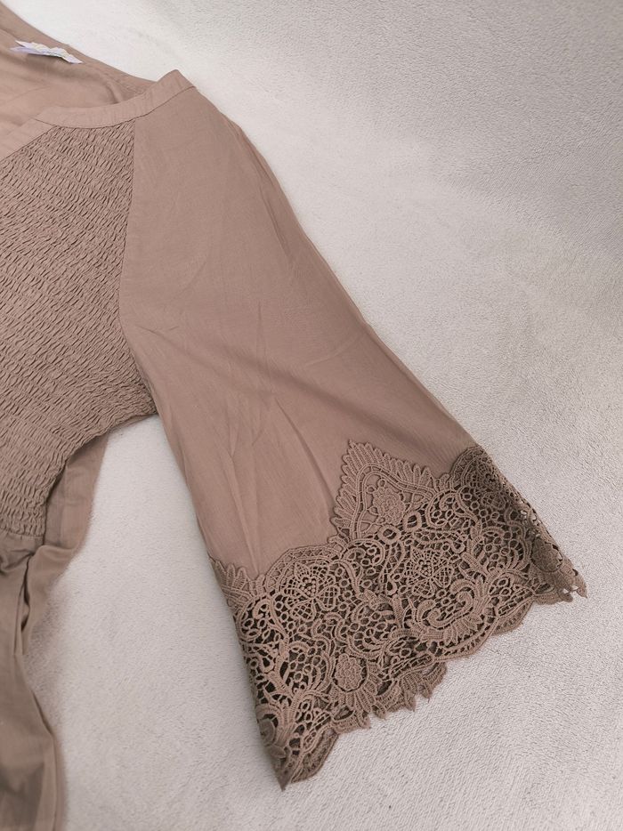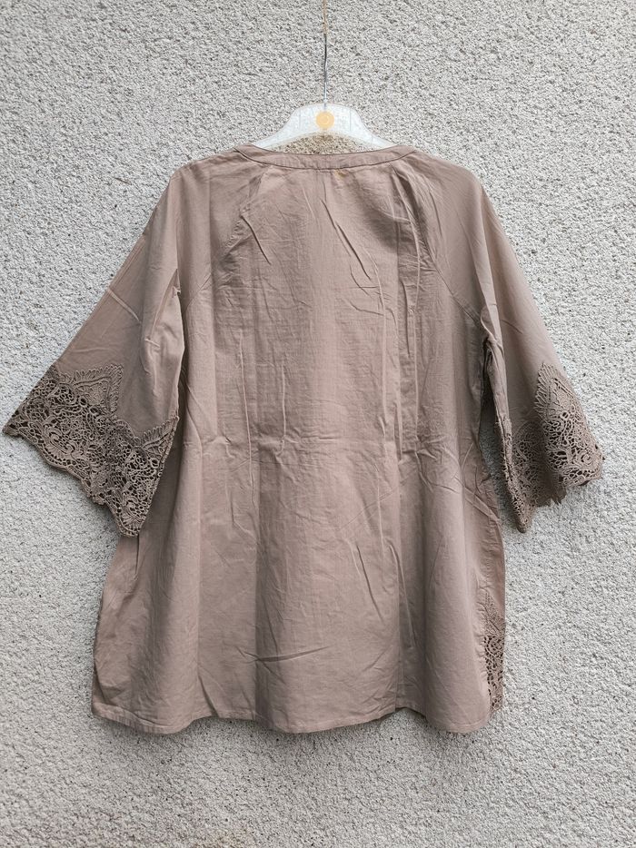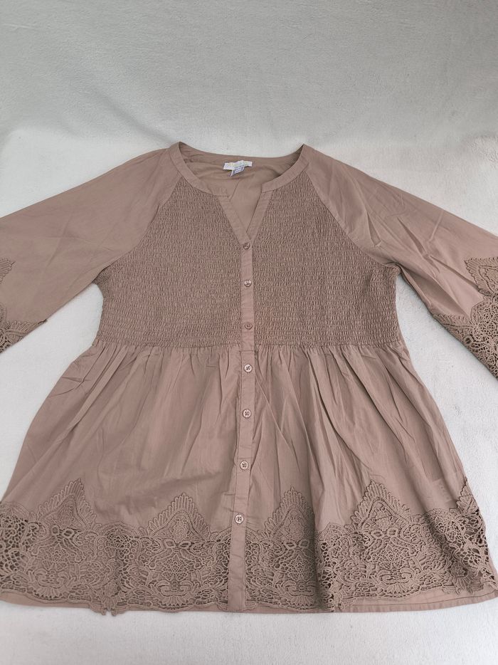 Chemise à manches 3/4 courtes Marque Alessa W. Taille 48 • Coloris marron beige • Fermeture par boutons • Broderie aux manches et bas • Manches évasées • Bande élastique sur le haut • Coton fin • Petites taches au dos Largeur aisselle à aisselle non étirée : 53 cm Largeur aisselle à aisselle étirée au maximum : 64 cm Longueur manche : 51 cm Longueur totale : 76 cm Longueur aisselle : 51 cm Peu portée, en très bon état #evelyne_taille_48