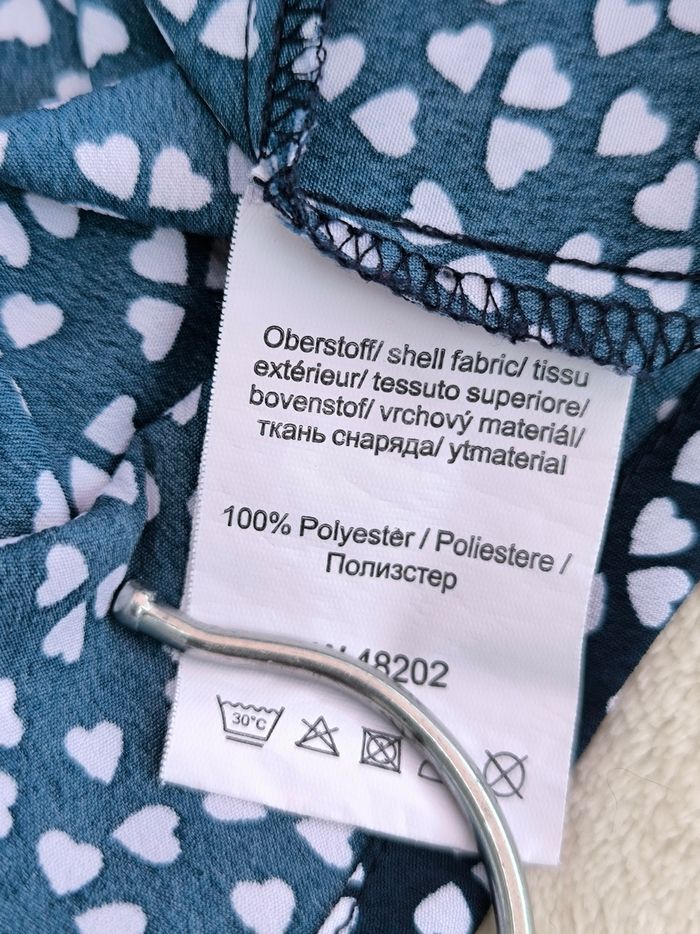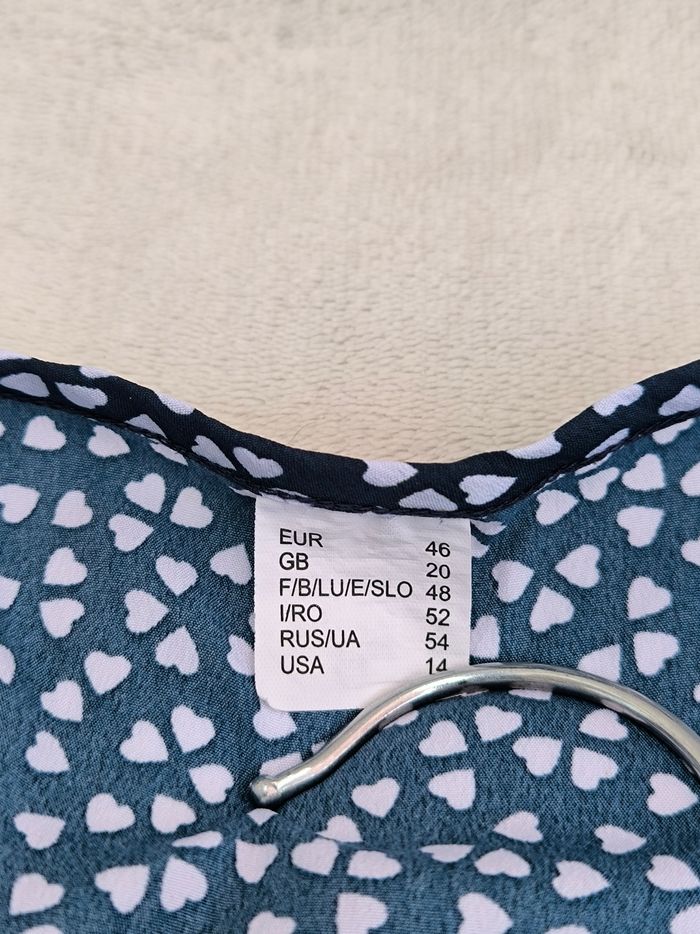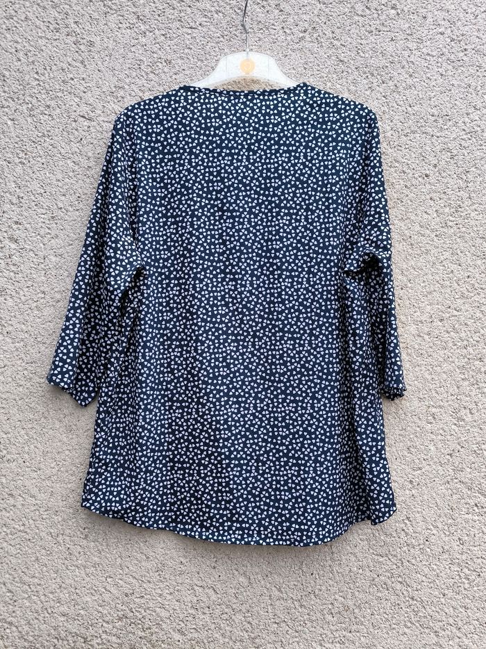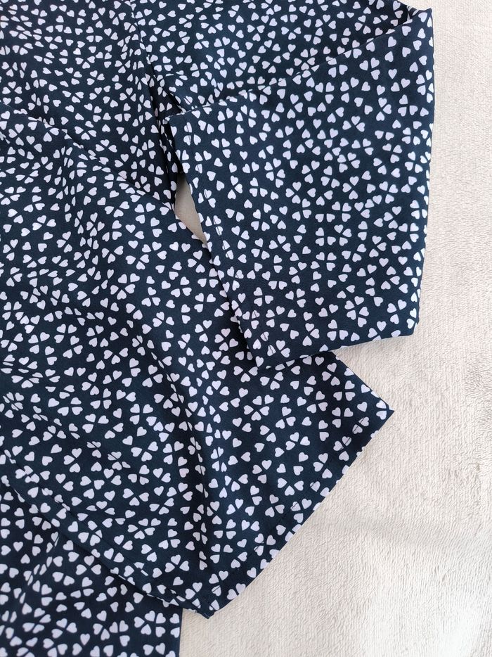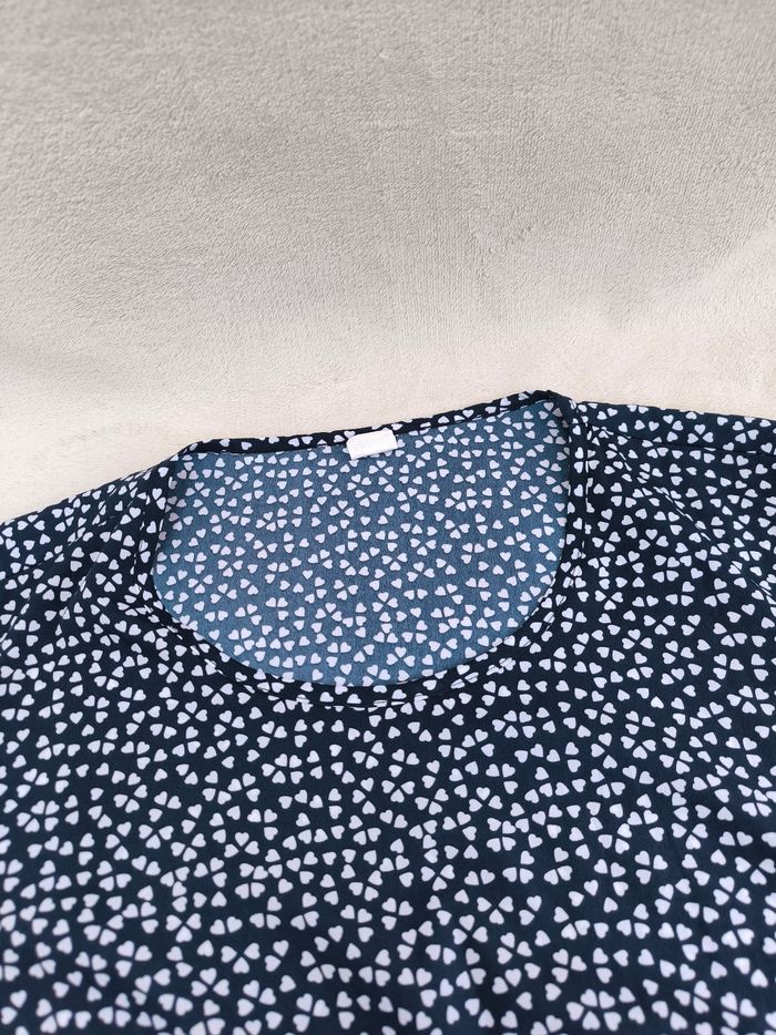 Blouse à manches 3/4 Taille 48 • Coloris marine, blanc • Col rond • Imprimés/Motifs cœurs • Tissu fin • Petite tache à l'avant Largeur épaule à épaule non étirée : 41 cm Largeur épaule à épaule étirée au maximum : 51 cm Largeur aisselle à aisselle non étirée : 55 cm Largeur aisselle à aisselle étirée au maximum : 67 cm Longueur manche : 45 cm Longueur totale : 74 cm Longueur aisselle : 42 cm Peu portée, en très bon état #evelyne_taille_48
