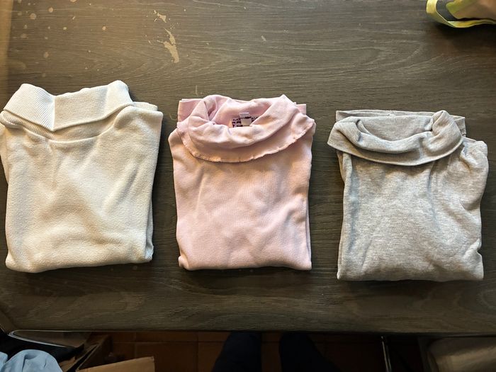 Lot de sous-pulls, comprenant : - Sous-pull rose (Vynil Fraise), tâché (voir photos) - Sous-pull gris (in Extenso), tâché (voir photos) - Sous-pull blanc côtelé (In Extenso), tâché (voir photos) Le lot peut être séparé 😉