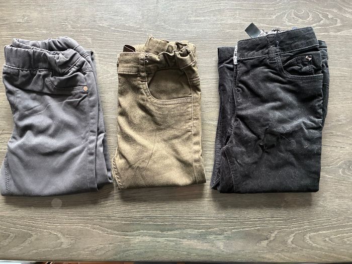 Lot de Pantalons, comprenant : - Pantalon en velours noir (Orchestra), ceinture ajustable, jamais porté - Pantalon gris (In Extenso), jamais porté - Jean slim kaki (Charlie & Prune) à ceinture ajustable jamais porté Le lot peut être séparé 😉