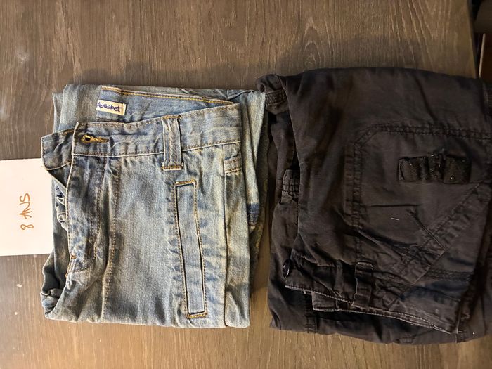 Lot de pantacourts/bermudas, comprenant : - Pantacourt en Jean bleu à ceinture ajustable (Alphabet), Jamais porté - Pantacourt noir, quelques imperfections (voir photos)