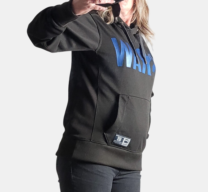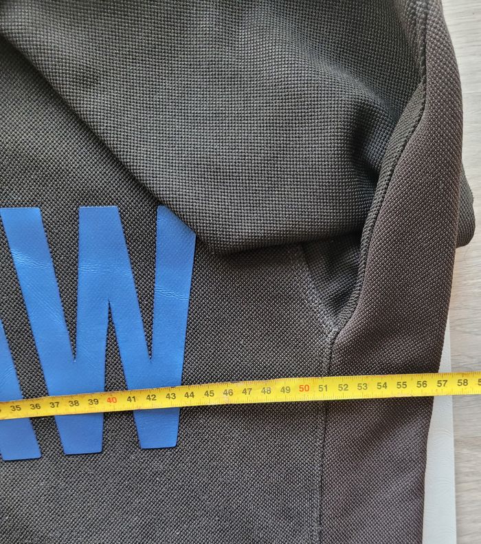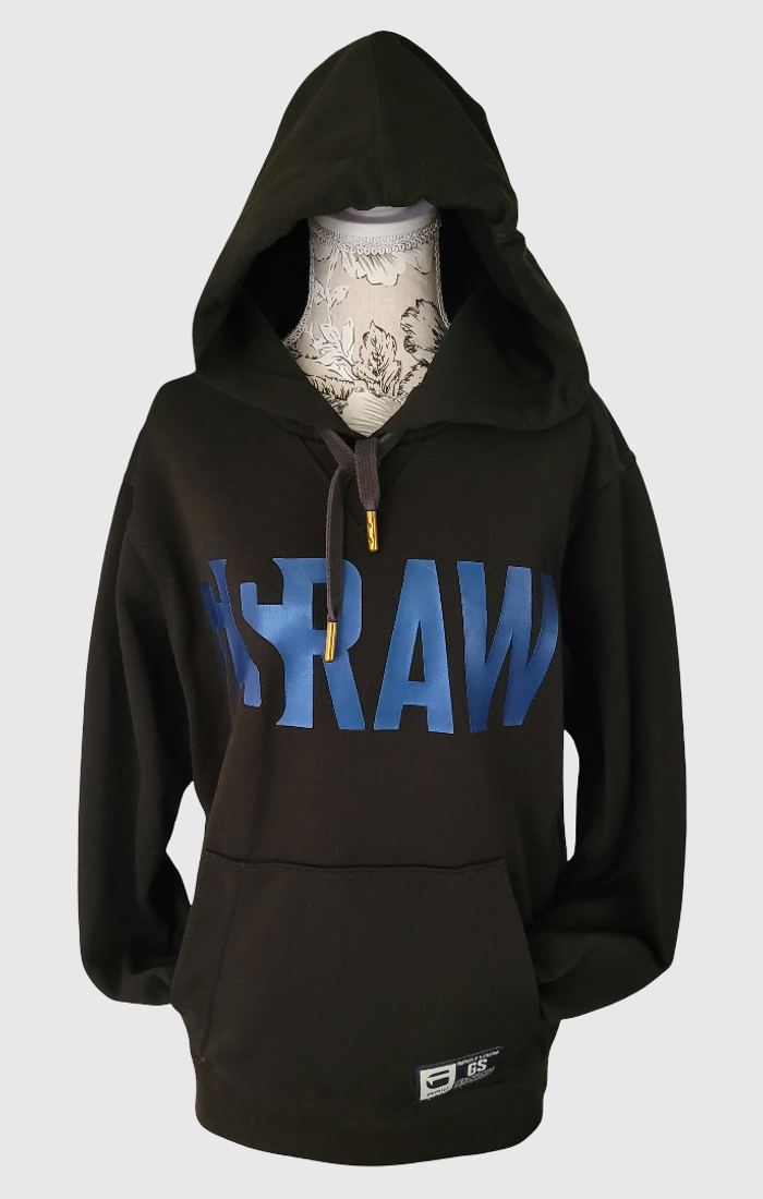 Sweat à capuche G-Star Raw noir avec inscriptions bleues, 2 cordons permettent de réajuster la capuche. Taille L sur étiquette, mais peut aussi convenir à une Taille XL, voir mesures sur photos. 100% Polyester. Légère imperfection sur une manche et la capuche : voir photos n° 9 et 10, à peine perceptible en réel.