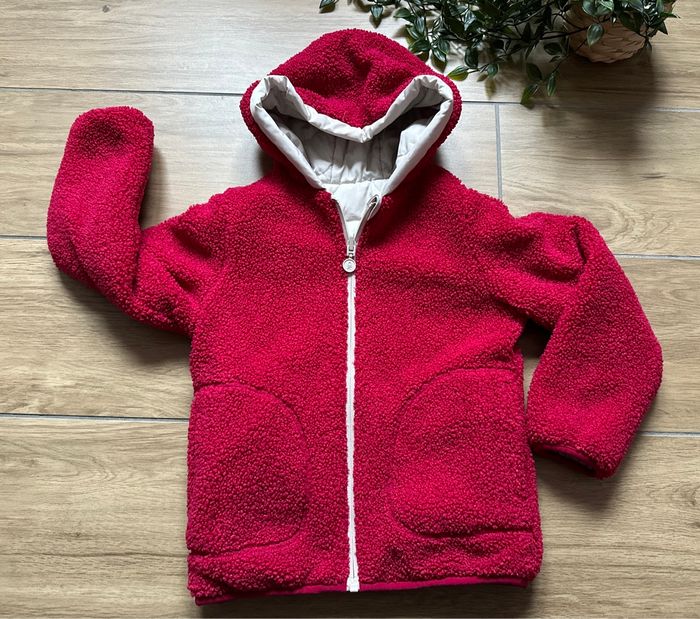 Manteau doudoune, veste réversible avec capuche Un côté beige, un côté bordeaux Un côté, K-Way, un côté, Moumoute polaire Marque : okaidi Taille : 5 ans Veste en excellent état des deux côtés comme neuve, très très peu portée