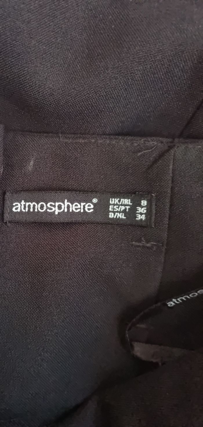 Jupe tailleur noir ,taille 34-36 marque Atmosphère,jupon intégré, longueur 64cm, largeur de la taille 35cm,largeur 44cm.