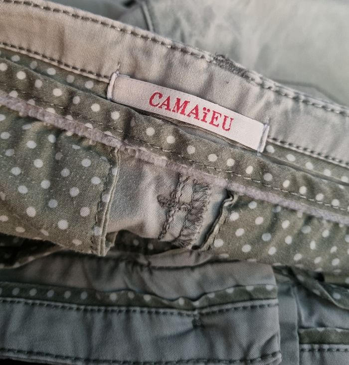 Jean vert pâle, taille 40 marque Camaïeu, longueur 94cm, largeur de la taille 40cm,largeur cuisse 26cm, largeur cheville 12cm.