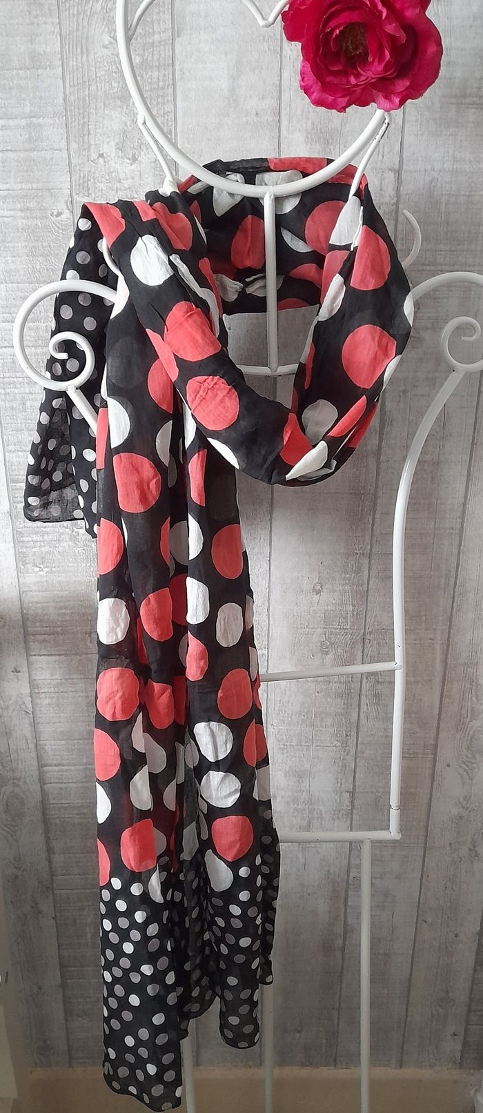 Foulard grand format (170 x 100 cm), noir avec pois rouges et blanc, tbe