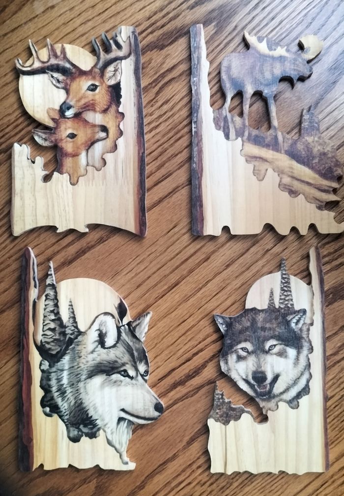 Cause changement de déco ,lot de 4 décorations murales en bois avec des motifs d'animaux sauvages. - Type de produit : Lot de 4 décorations murales - Matière : Bois - Motifs : Cerfs, loups et caribou - Couleur : Marron - État neuf jamais utilisé - hauteur 20/25 cm 12€