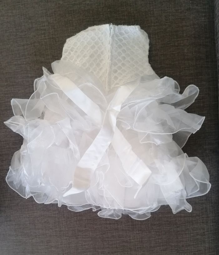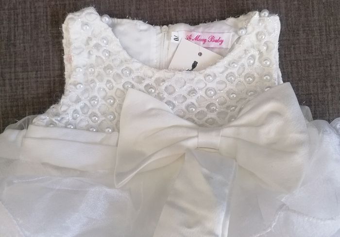Robe de cérémonie bébé. Blanche. 70cm ( 6-9mois). Fermeture éclaire derrière, ceinture en satin avec papillons devant. Décoration perle Neuf avec étiquette. 17€