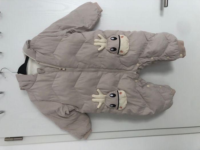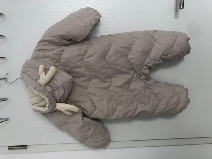 Jolie combinaison avec capuche. Fermeture devant avec tirette et ouverture boutons pression sur le bas. La couleur est plus claire que sur les photos (plus beige) Tient bien chaud Motif renne Sans marque Taille 3 ans, 100 cm
