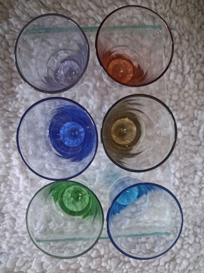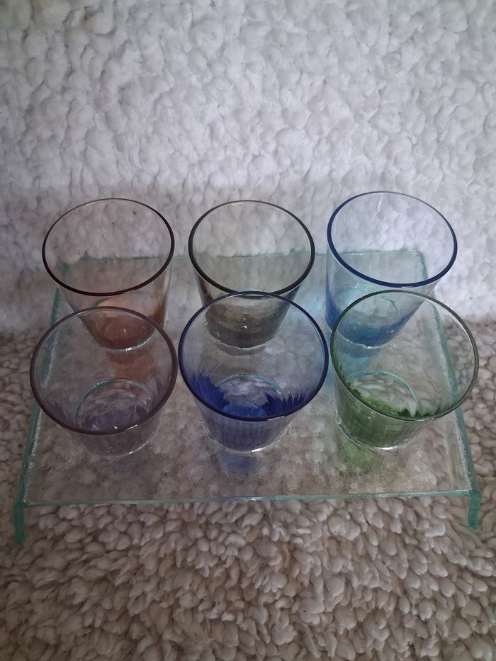 6 verres à liqueur ou à verrines dans leur support, de couleur différente. Très bon état (sans la boite)