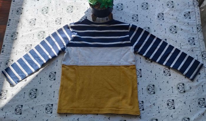 Tee-shirt ML bleu/blanc/moutarde en bon état (bouloches) sans marque pour garçon taille 4 ans
