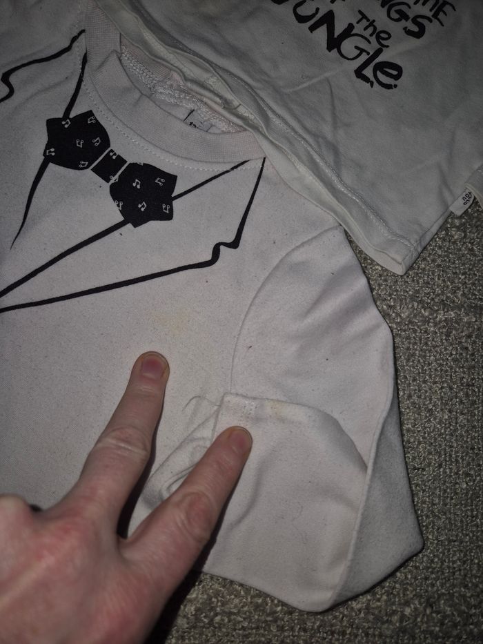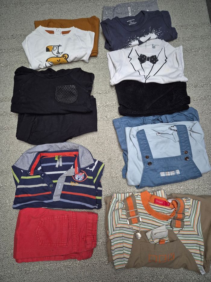 Lot 12 mois garçon Des ensembles salopette obaibi, tee shirt sans marque Salopette Reebok, tee shirt et chaussettes ( bouloches) tissaia Photo 4 haut orchestra pantalon orange gemo un peu delavé Ensemble jogging pull à capuche sans marque Photo 5 Ensemble kiabi pantalon tbe tee shirt trop + taches voir photo 7 Ensemble complice pantalon trou derrière voir photo 8 Photo 6 Ensemble pantalon velours tbe et tee shirt dessin noeud papillon tee shirt taché voir photo 9 Je vais essayer de détacher les 2 tee shirts Possibilité de vendre séparément