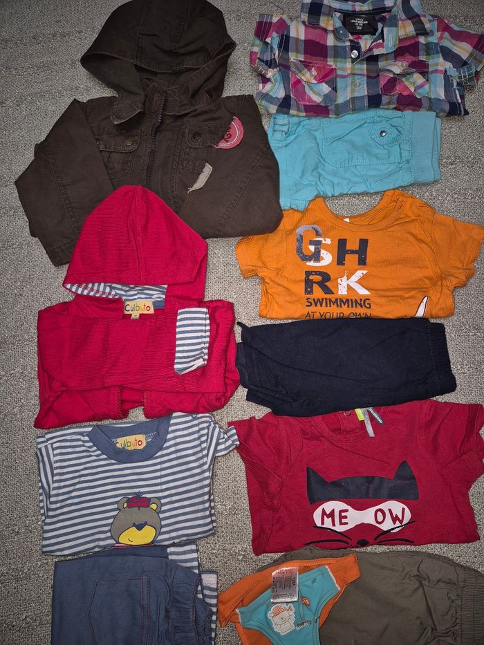 Lot 12 mois été Il comprends une veste/ manteau 1 ensemble tee shirt gilet et pantalon neuf juste lavé 1 chemise h&m 2 shorts 1 kiabi 1 sans marque, 1 tee shirt rouge orchestra 1 ensemble pyjama short tache sur le tee shirt voir photo Et un Slip de bain neuf