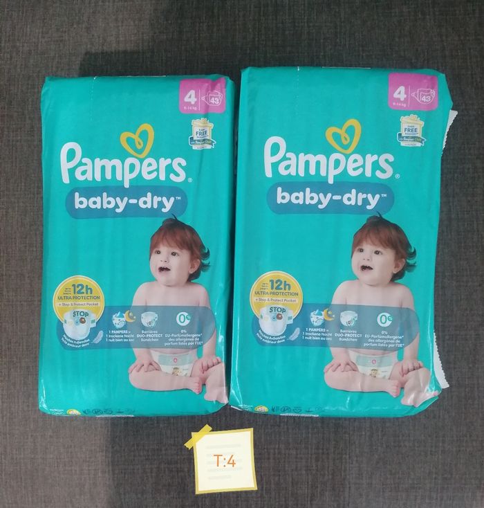 2 paquets de Cartouches pampers baby dry. Taille 4. 9/14kg 43c ×2 = 86 couches au total. Le lots 25€