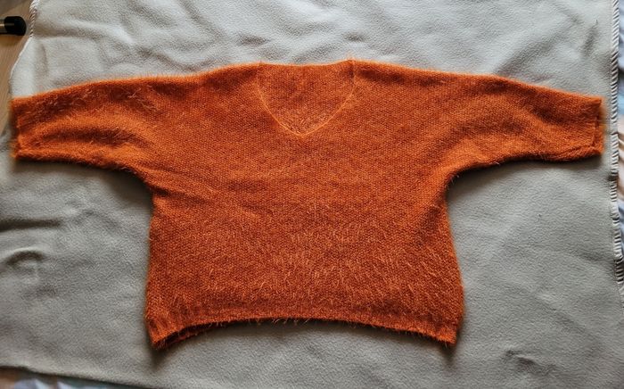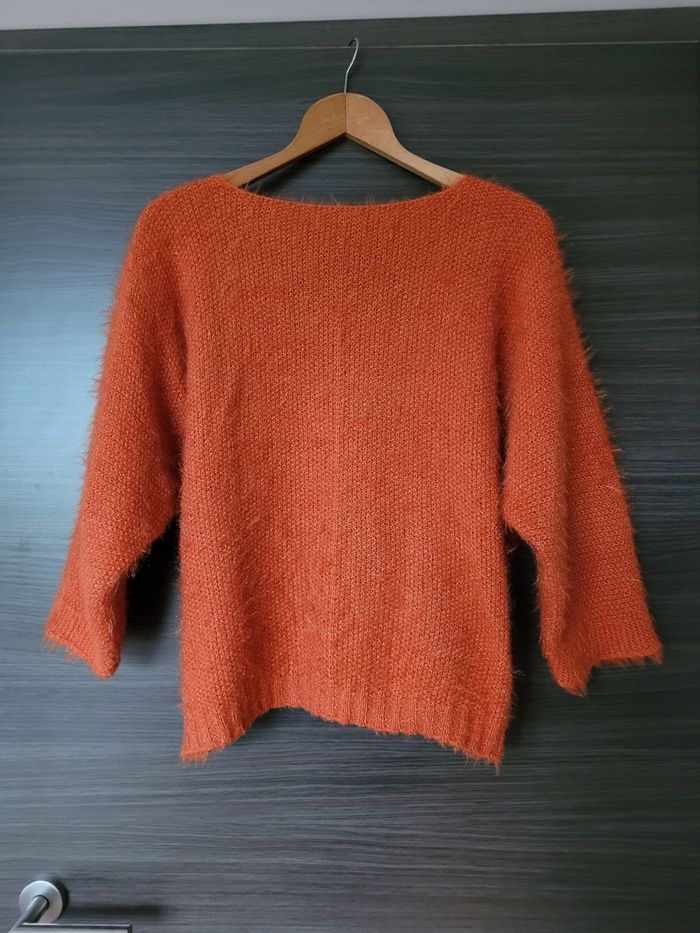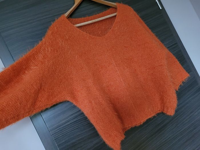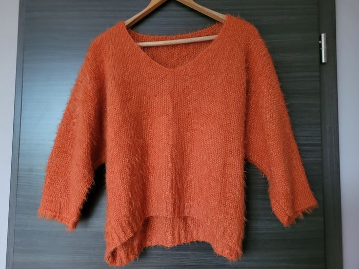 Pull oversize Taille unique Orange 10% de laine Made in italy En très bon état Taille unique – convient environ du 44 au 50 FR. Pas d'étiquette de taille Mesures : largeur aisselle à aisselle 62 cm, longueur 59 cm.