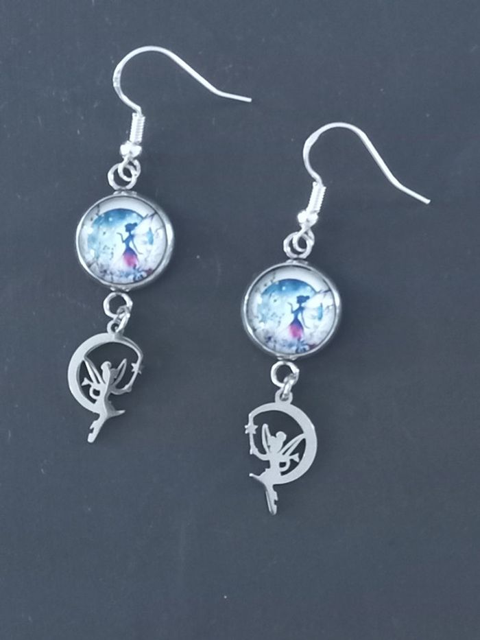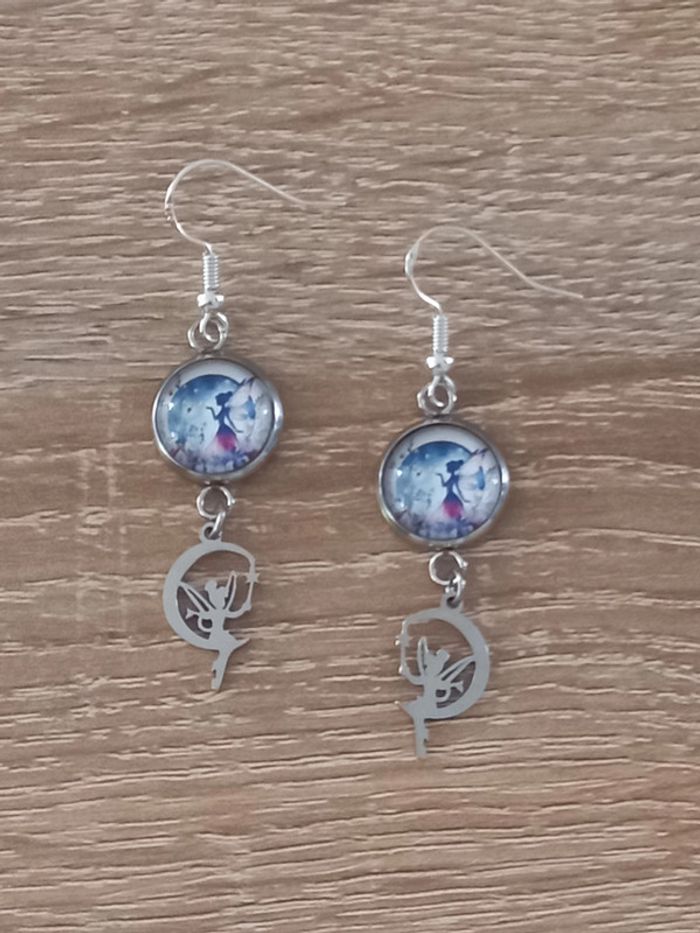 Ajoute une touche féérique à ton style avec ces boucles d’oreilles argentées en acier inoxydable, ornées d’un cabochon 12 mm illustrant une fée et d’un pendentif fée assorti. Elles sont montées sur un hameçon en argent 925 pour un confort optimal.🧚♀️✨