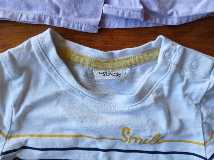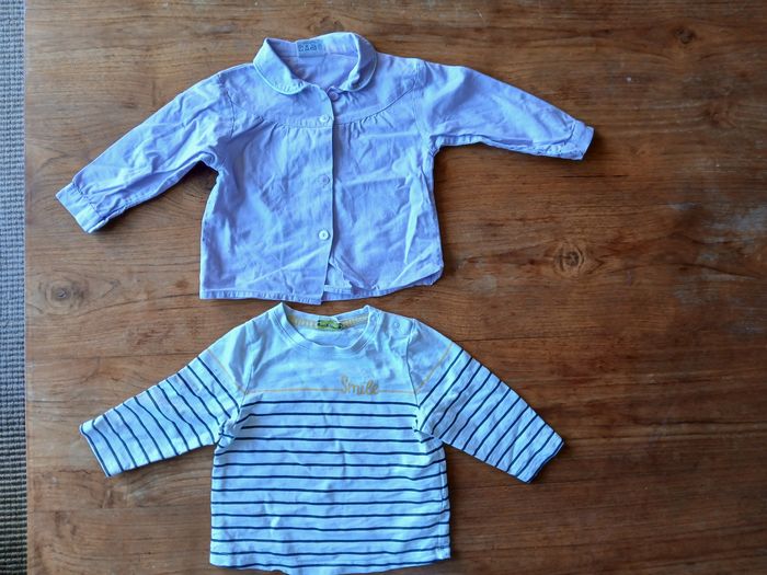 Lot de deux hauts a manches longues : - 1 Chemisier violet "Z", taille 12 mois - 1 marinière blanche Tape a l'Oeil, petites taches sur le devant, taille 12 mois / 74 cm. Bon état