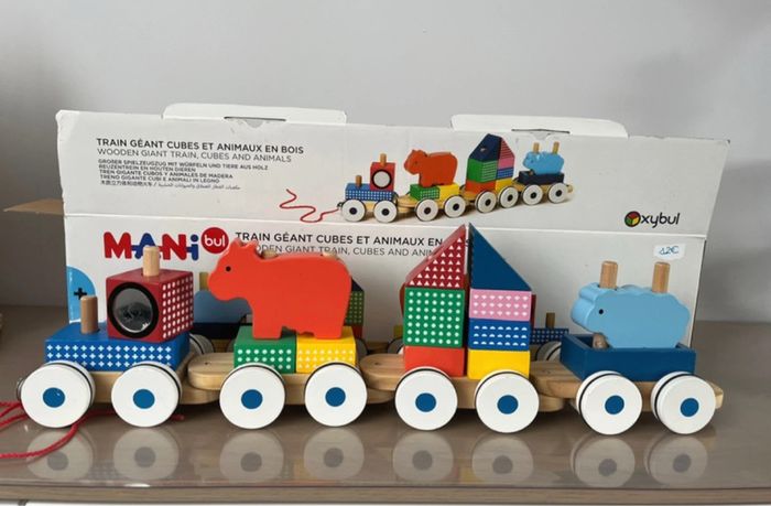 Avec ce train géant cubes et animaux en bois, votre enfant s'apprête à embarquer pour un voyage inoubliable ! Dans un premier temps, il peut découvrir les différentes formes séparément : cubes, triangles et pavés stimulent sa vue et son sens du toucher. Puis il développe sa motricité fine en empilant librement les formes et les deux animaux sur les tiges élastiques des quatre wagons amovibles. Prêt ? Le départ est imminent ! Grâce à la ficelle à tirer, il va adorer faire rouler son train géant qui l'incite à se déplacer. Le caoutchouc antidérapant sous les roues rend le train silencieux et la peinture à l'eau des wagons garantit à votre enfant de faire des découvertes en toute sécurité !