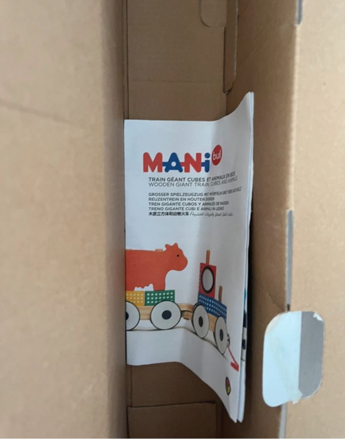 En bois. Contient : 4 wagons dont 1 avec 1 clochette et 1 cordelette, 6 petits cubes (dim. : 4,5 x 2,2 cm) , 1 rectangle (dim. : L 9 x l 4,4 x H 2,2 cm) , 2 cubes dont 1 avec miroir (dim. : 4,5 x 4,5 cm), 2 triangles (dim. : 4,4 x 4,4 cm) et 2 animaux (vache et mouton). Dim du train géant : L 56 x l 9 x H 13,5 cm. Finition : peinture à base