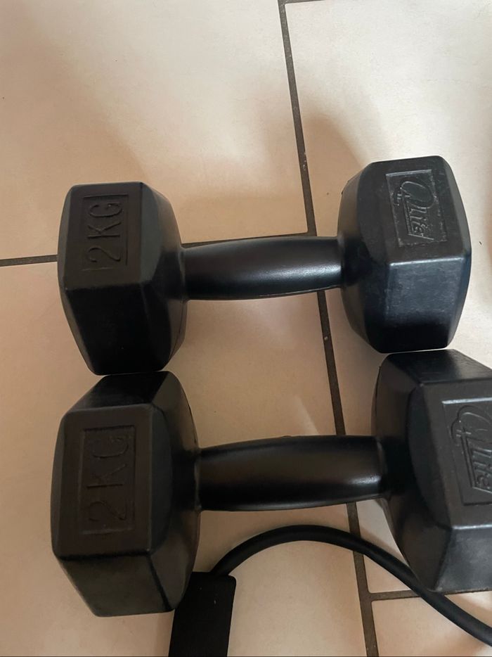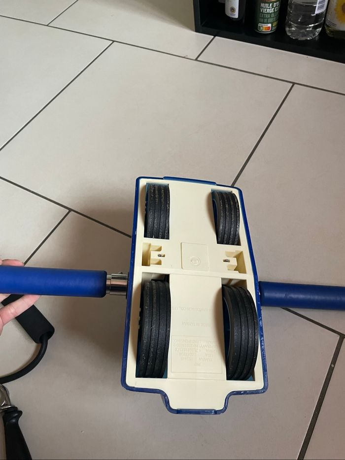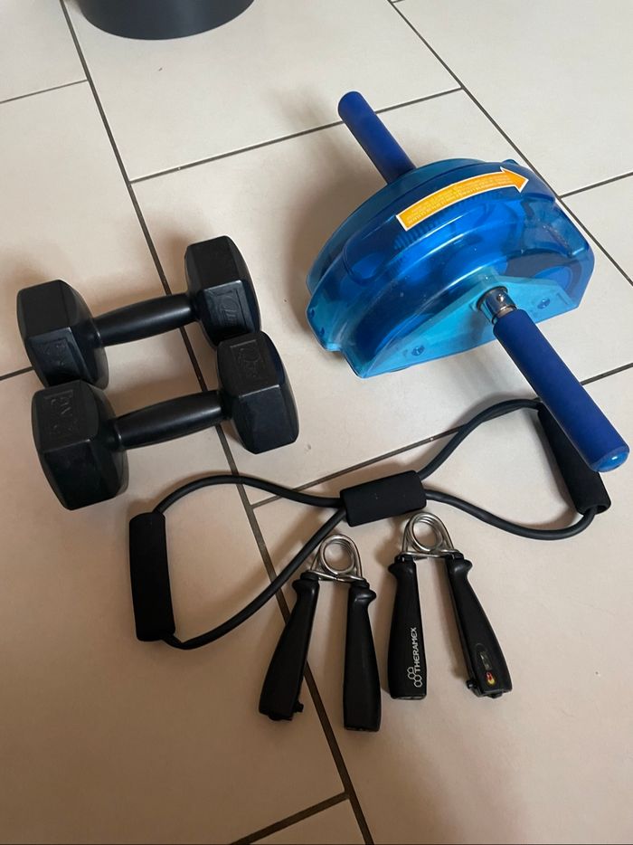 2 poids 2kg chaucun 1 rouleau abdos 2 poignet musculation 1 élastique 20€ le lot