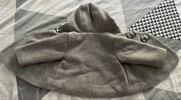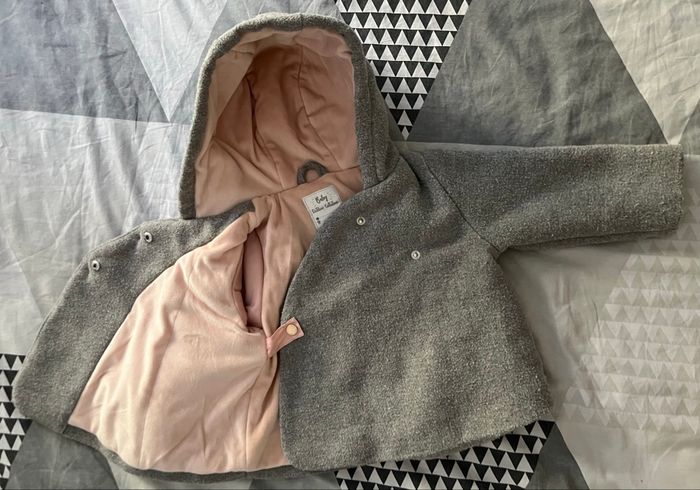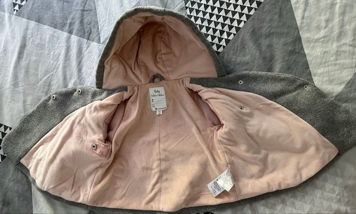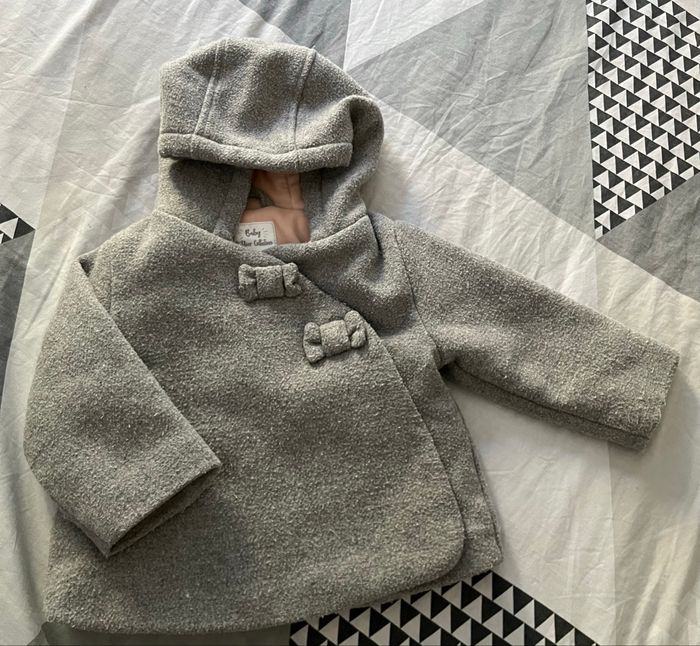 Manteau de la marque Vertbaudet, taille 12 mois (74 cm) avec petits noeuds à l’avant. Gris un peu bouloché, intérieur rose effet velours. Avec capuche non détachable. Très bon état.