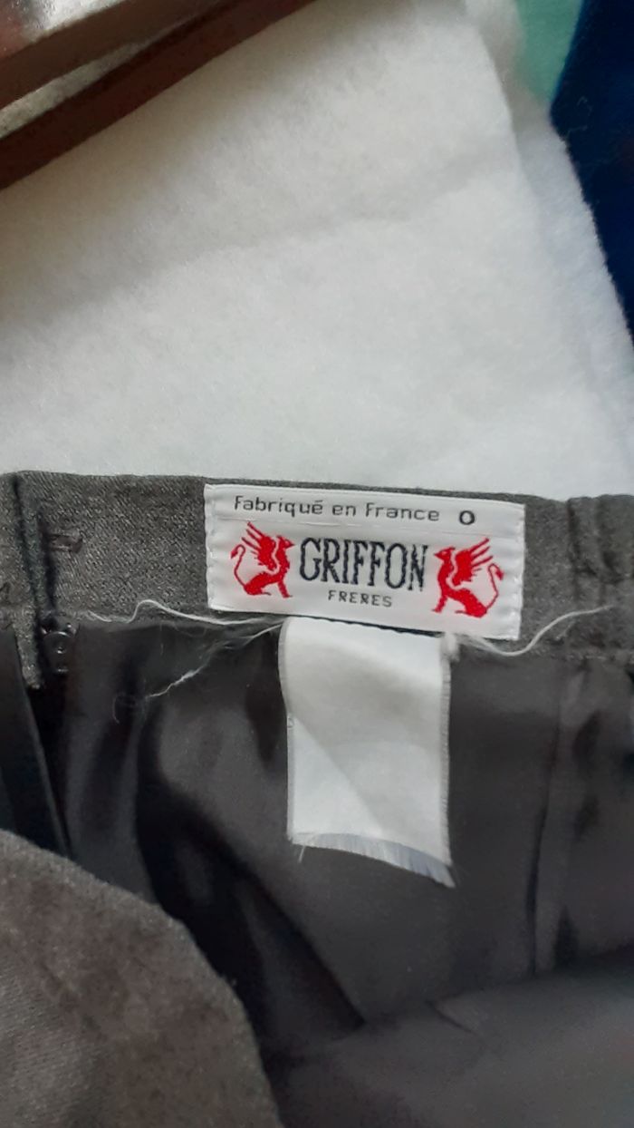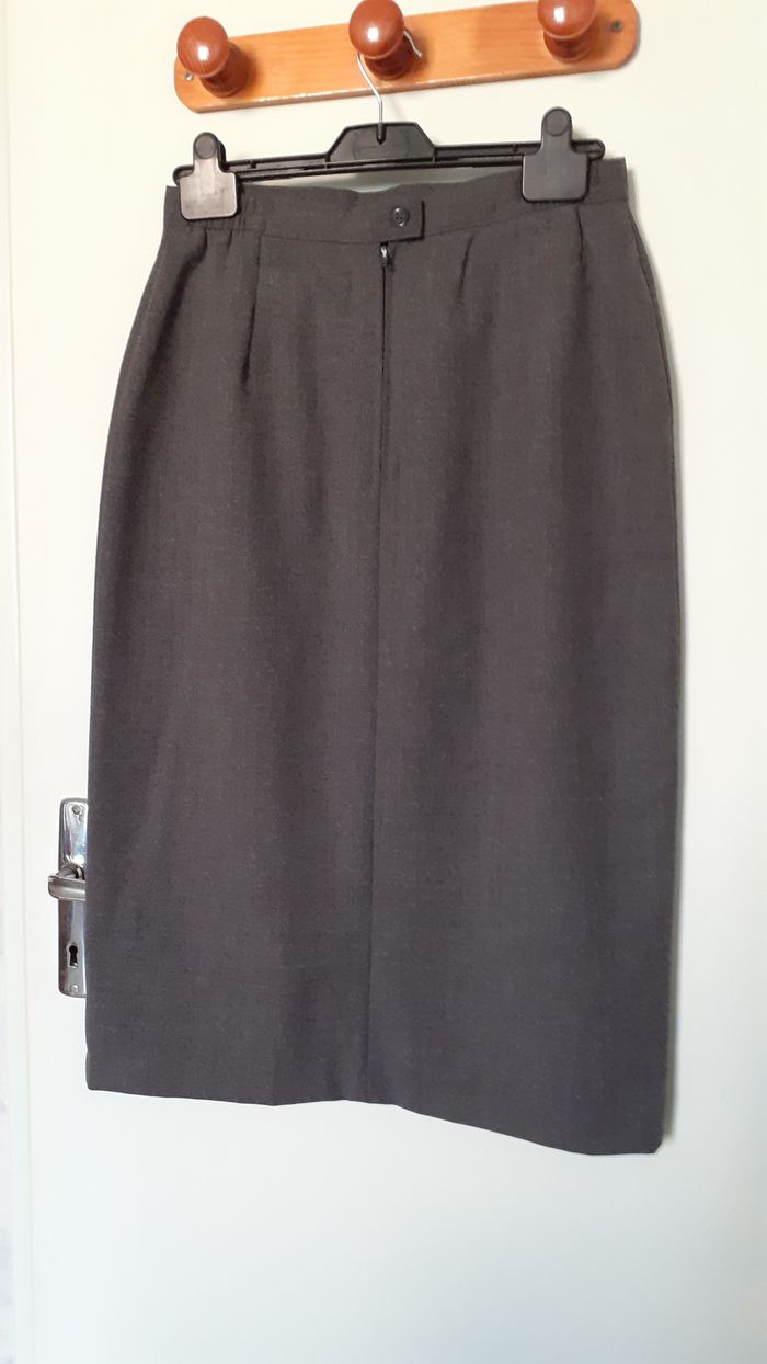 Vends une jupe droite, mi-longue, fendue sur un côté, en laine peignée fine, doublée, fronces sur les côtés arrière, couleur gris uni, marque Griffon frères, taille 38-40. Longueur : 73 cm Ceinture à plat : 36 cm.