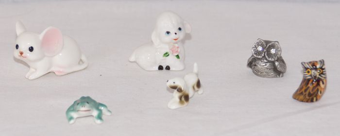 6 miniatures Thème Animaux - 5 en céramique : Chien, Souris Mouton, Grenouille, Hibou - 1 en étain : Chouette