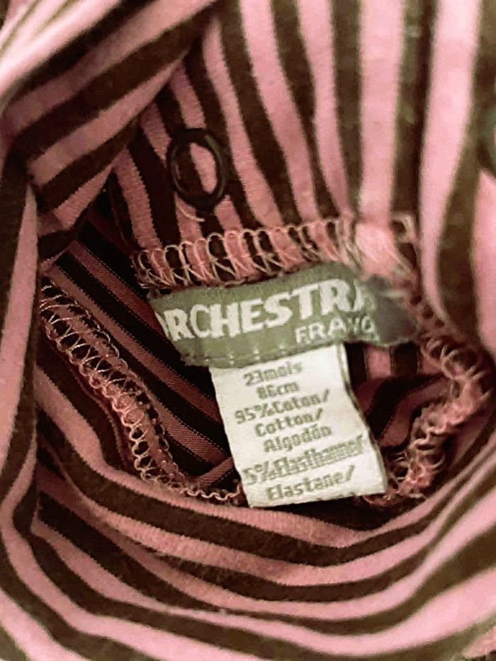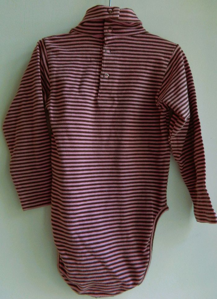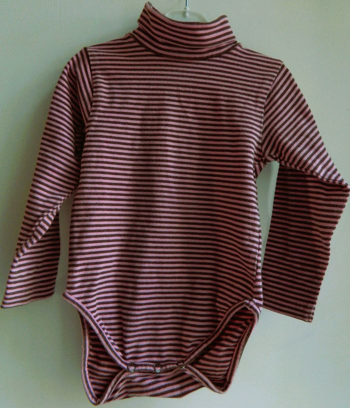 Bodies manches longues T 23 mois Marque "Orchestra" En coton et élasthanne Rayé marron et élasthanne Col roulé Boutons pressions dans le dos et entrejambes Très bon état Envoie sous 48 h