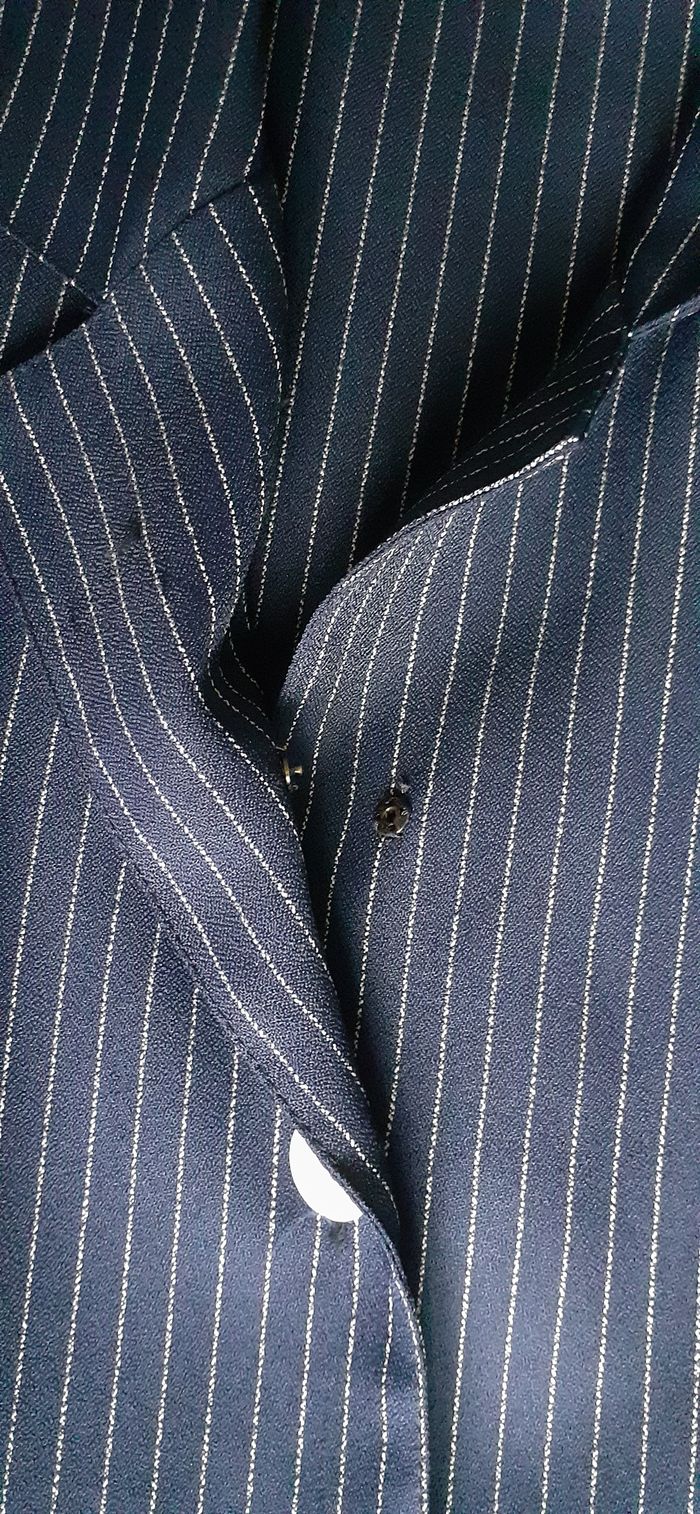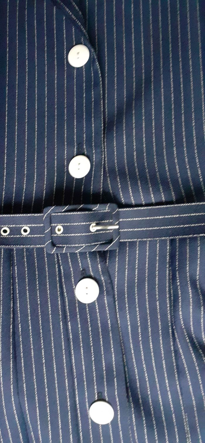 Vends une robe manches courtes, plissée, avec ceinture assortie, en polyester épais, tenue impeccable, ne se froisse pas, couleur bleu marine avec fines rayures verticales blanches, un petit bouton pression a été rajouté sur le décolleté pour le réduire si besoin (voir photo 3), taille 42-44. Longueur dans le dos : 100 cm Largeur aisselle à aisselle : 53 cm Largeur au niveau des hanches : 54 cm.