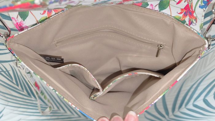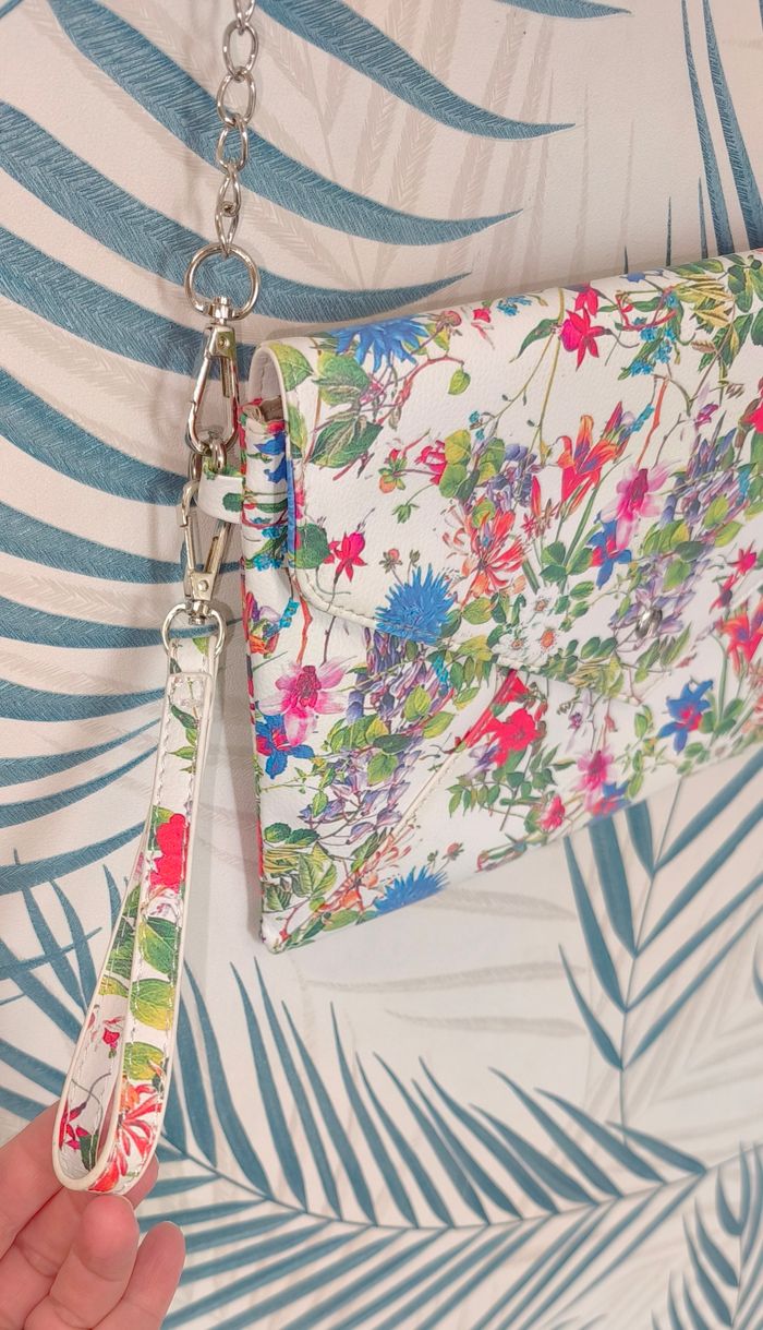 Sac à main bandoulière style pochette avec un porte-clés assorti. - Blanc avec motif floral - Ouverture par bouton pression - Divers poches intérieures zippées et une sur l'arrière - Matière : PVC - Doublure 85% polyester, 15% coton - Dimensions : Longueur 29 cm, Hauteur 19 cm - épaisseur 1 cm ℹ️ Neuf (jamais utilisé)