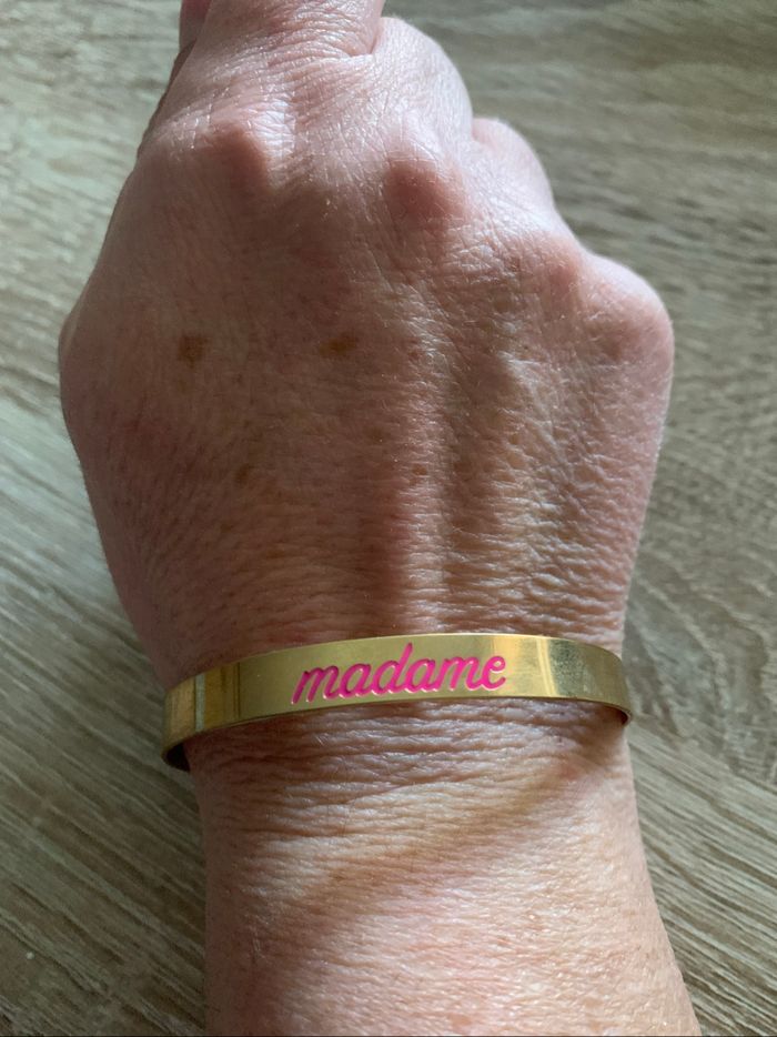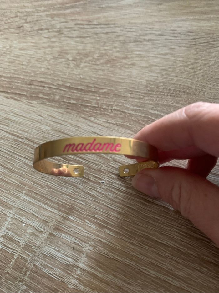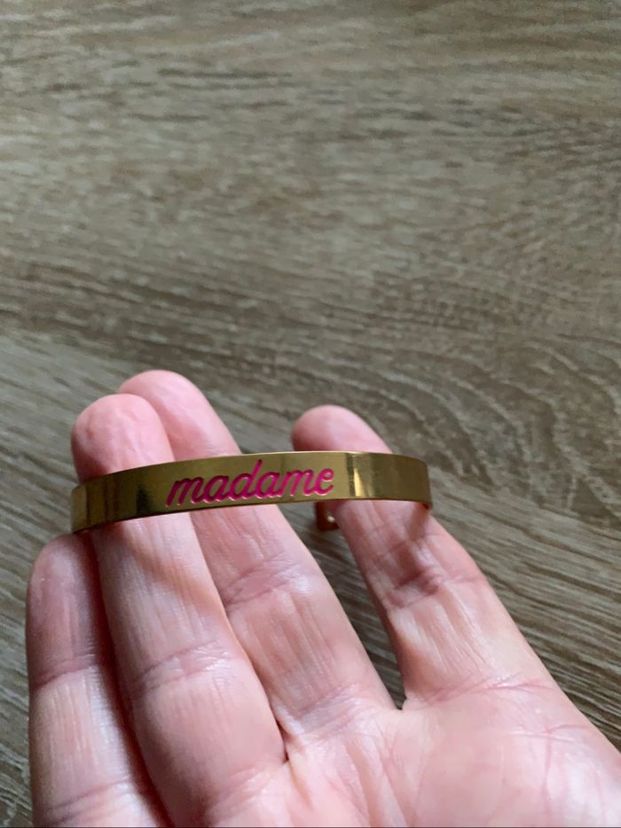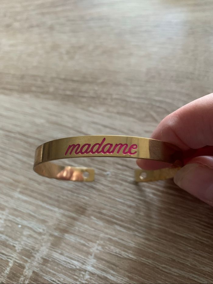 Bracelet jonc gravé «  Madame «  en laiton doré à l’or fin 24K recyclé . 0,7 cm de large Logo gravé à l’intérieur ( voir photo) Pièce faite à la main dans l’atelier parisien de Monsieur Simone Envoi rapide et soigné sous protection