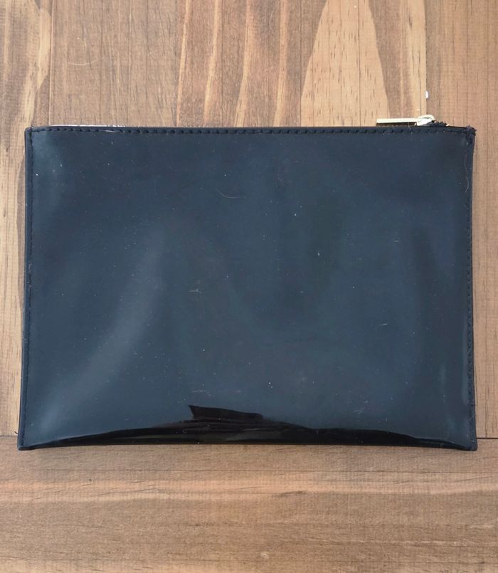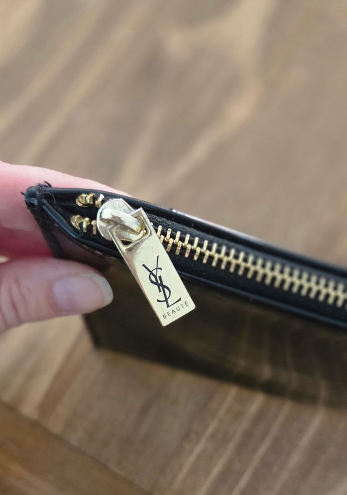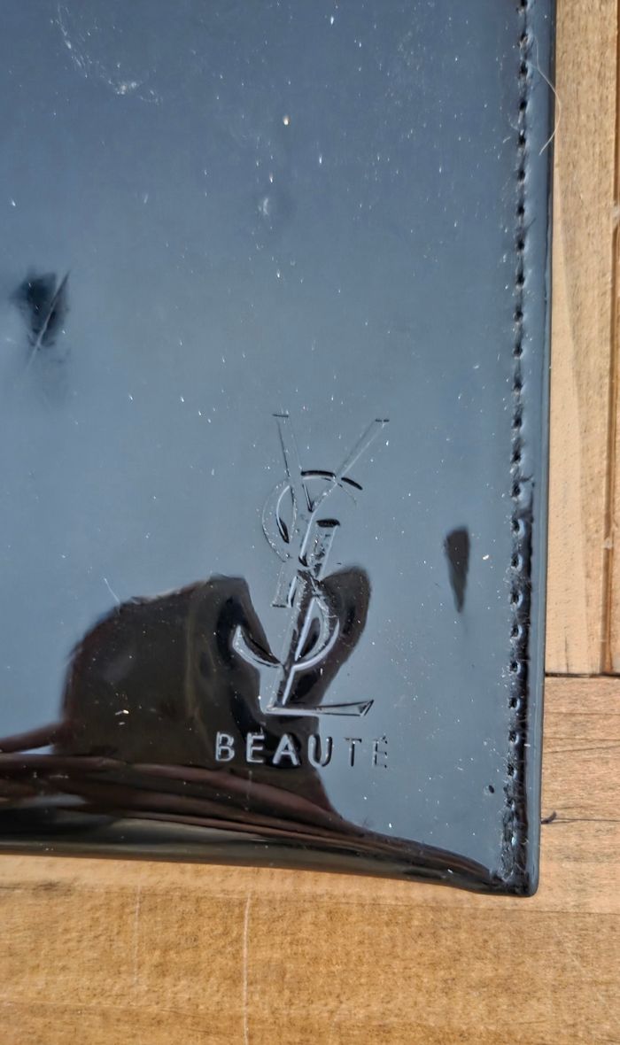 Élégante pochette Yves Saint Laurent Beauté, en simili vernis noir, finition brillante et détails dorés ✨