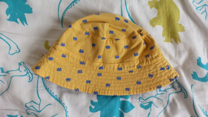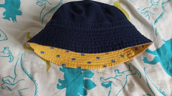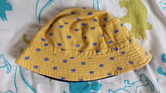 Bob / chapeau réversible. Soit il est jaune avec motif crabe bleu, soit il est uni bleu marine. Très bon état. L'étiquette intérieure a été coupée