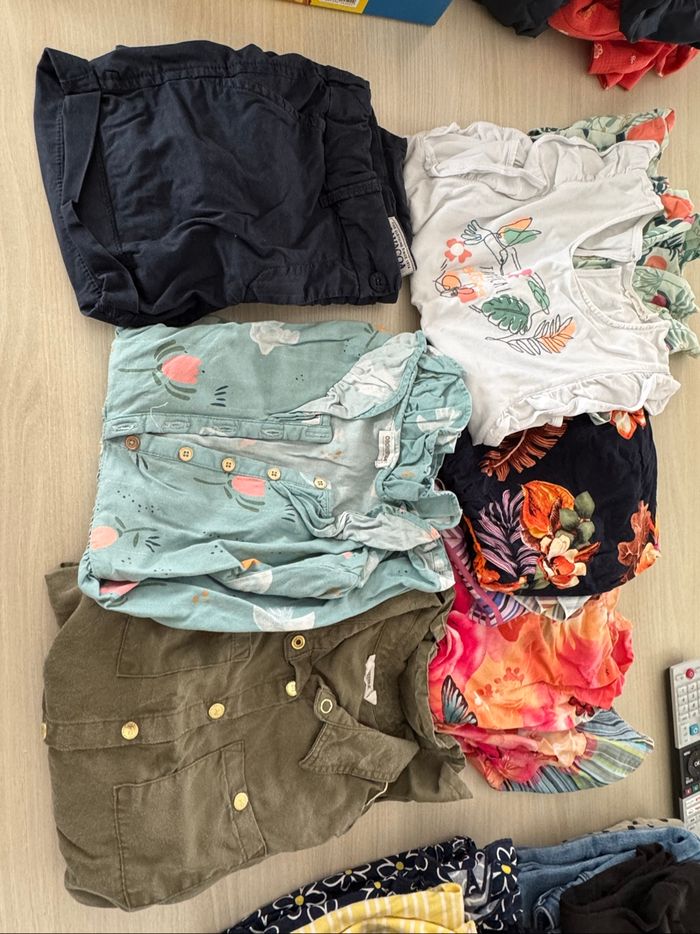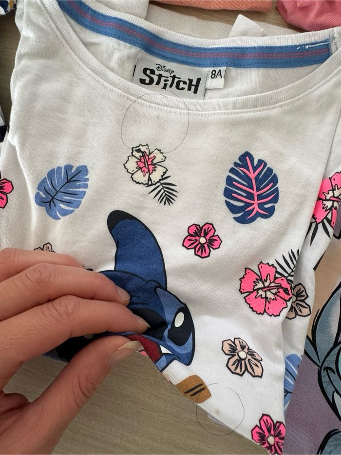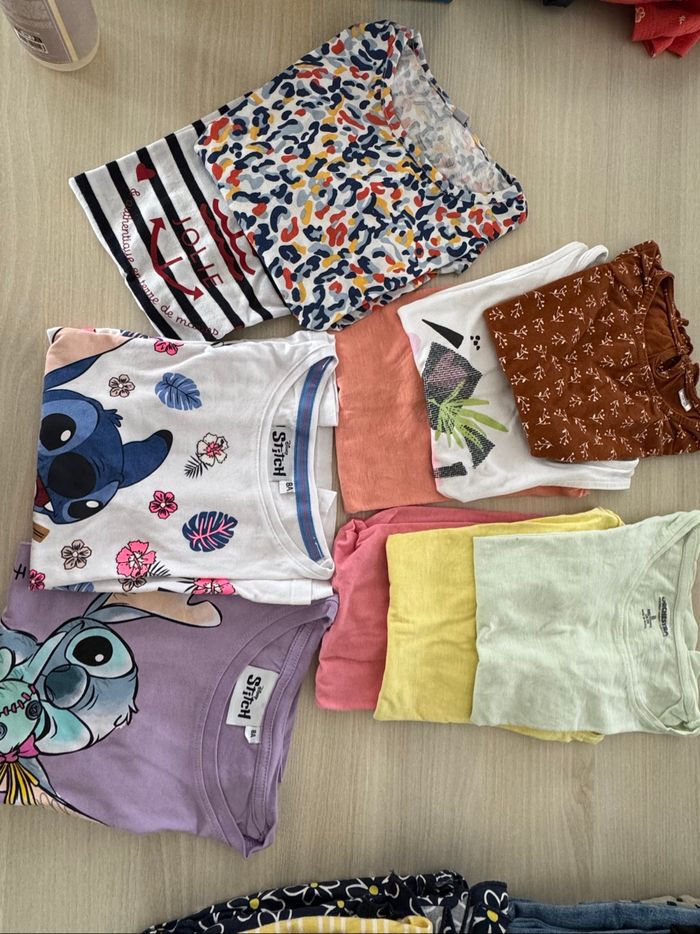 Vends lot de vêtements été fille taille 8 ans Le lot comprend: 2 tuniques manches longues 1 short 8 t-shirt 2 débardeurs 2 robes à bretelles 1 combi short 1 veste en jean 2 maillots bain Un des t-shirt stitch comporte 2 petites taches (voir photo) Les vêtements sont un peu froissés car mis en carton depuis quelques semaines… Certains vêtements ont été plus porté que d’autres mais tout reste en état pour être encore porté Principalement de marque orchestra