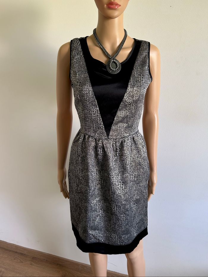 Magnifique robe dorée et noire sans manches, de marque Morgan. Fermeture dans le dos. Taille 36. Jamais portée, état neuf. aisselle à aisselle 43 cms taille 34 cms longueur depuis épaule 88 cms 61% polyester, 28% coton et 11% fil métallisé