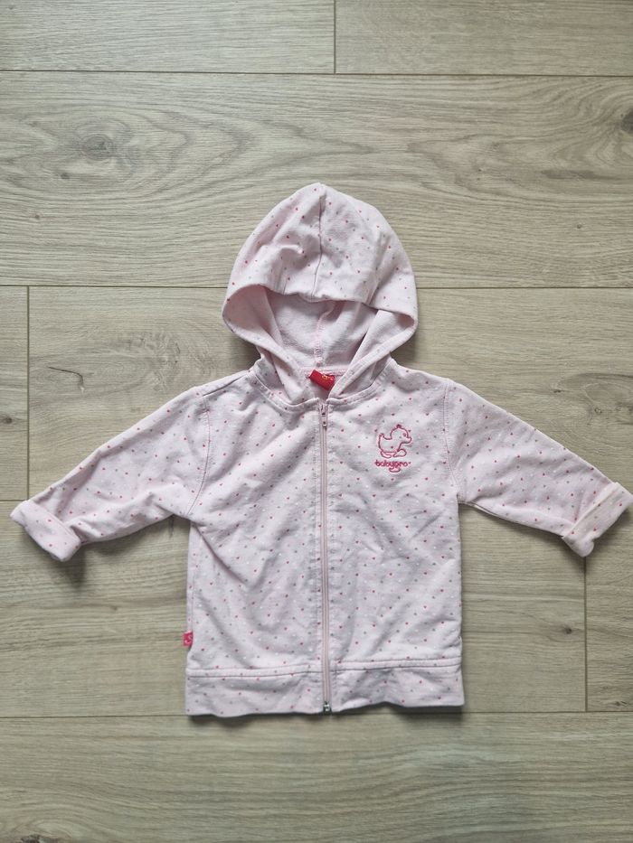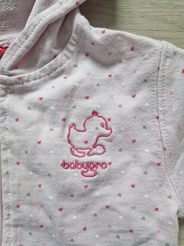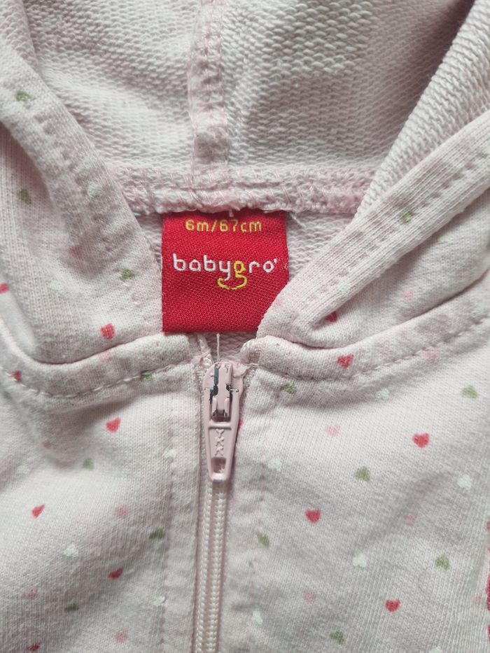 Sweat à capuche bébé fille Babygro 6 mois rose avec des coeurs.. Bon état. Réductions sur les lots activée : 2 articles 10%, 3 articles 20% et 5 articles 30%.